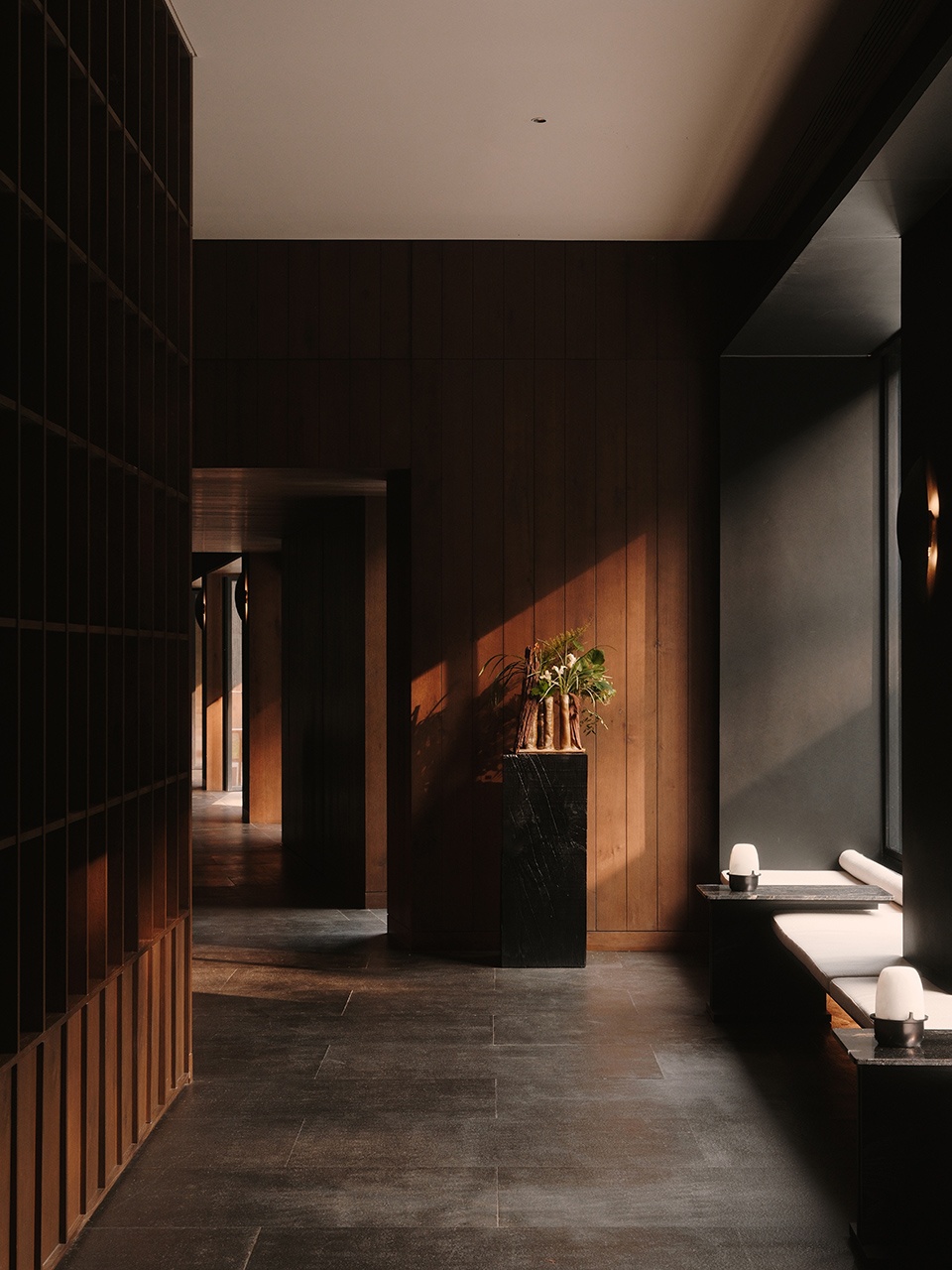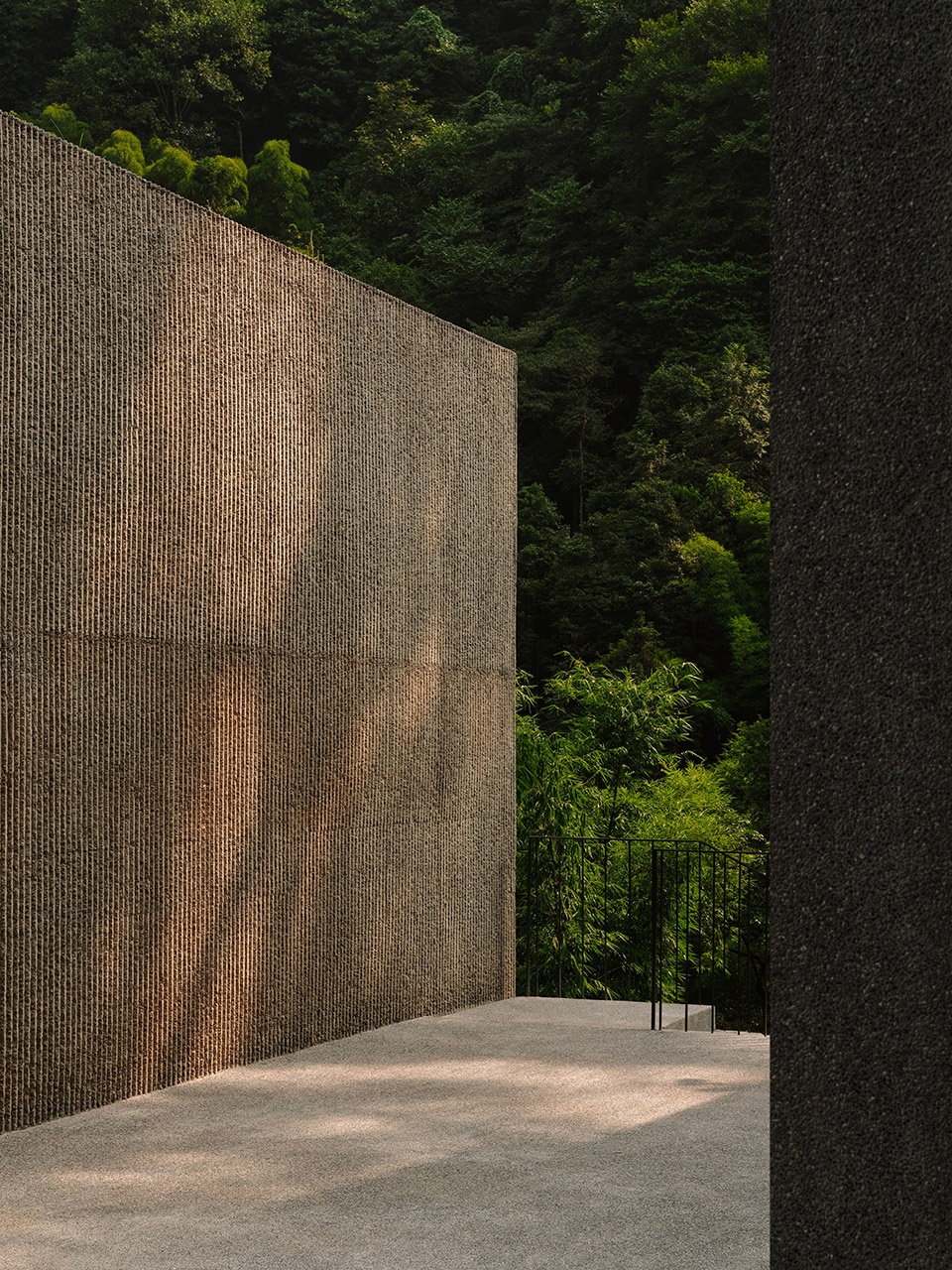 入口接待空间手工凿刻的混凝土立面,粗粝而真实的触感赋予建筑一种恒久质感。凿刻出的肌理表面,在光影下显露层次,从抵达的第一刻便传递出空间的真实与永恒。