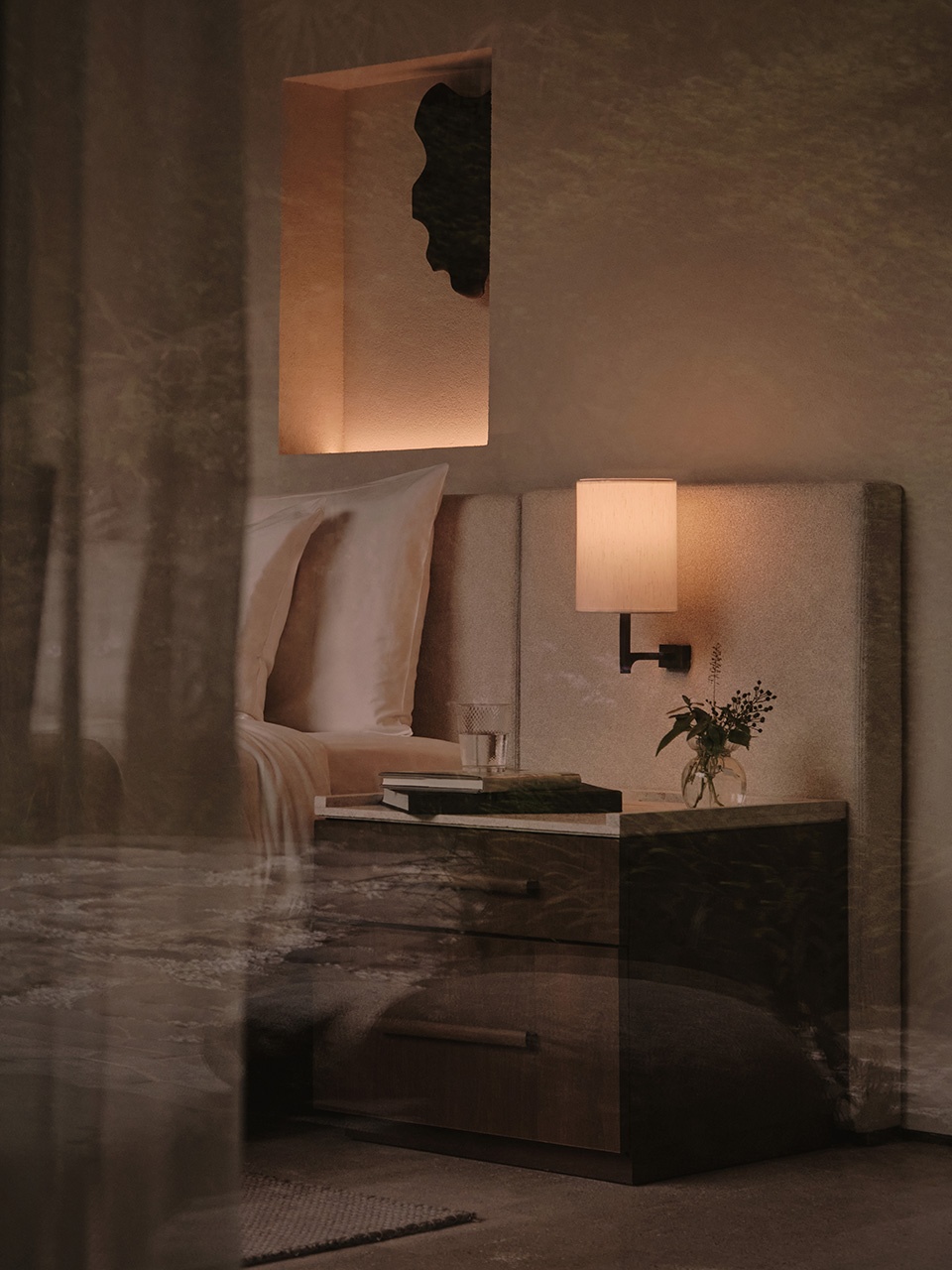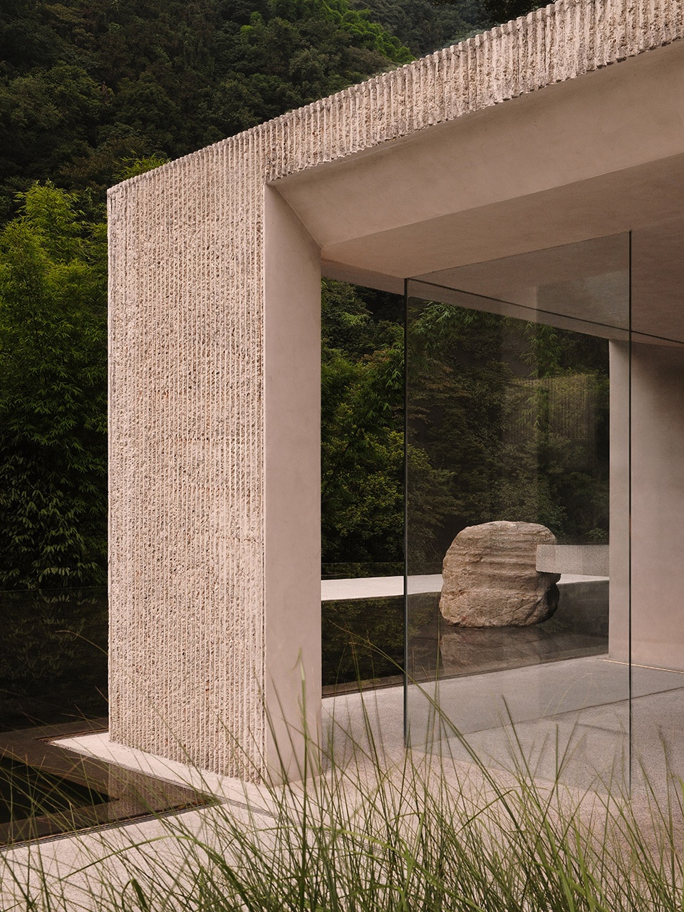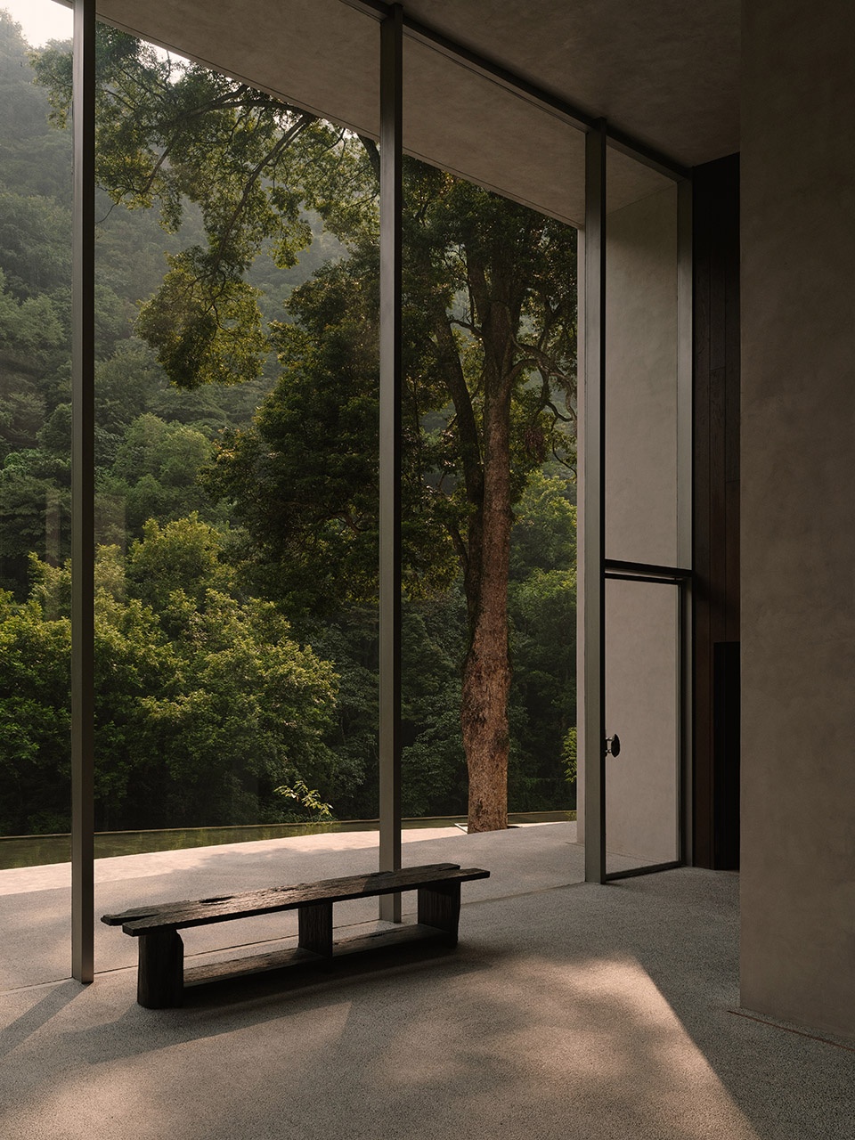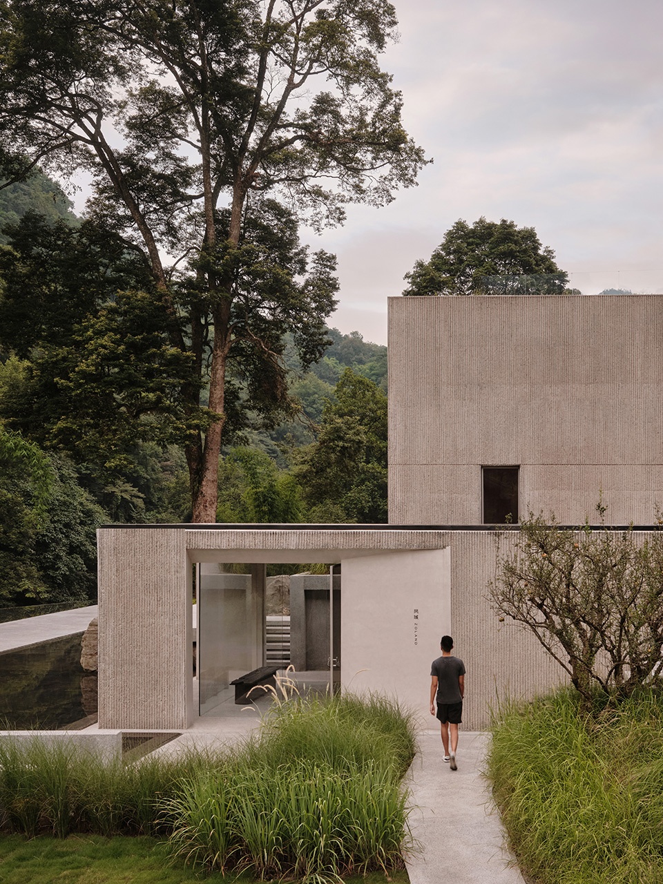 位于场地最高点的客房,立面覆以质朴的水洗石,树木掩映下,远观几乎隐于山林;推门而入,整面落地窗将宁静山峦尽收眼底,框景于山,如同一幅展开的山水画,营造出沉浸的观景体验。
