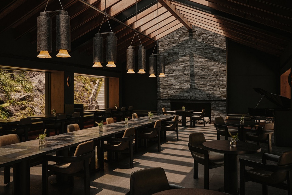 The dining hall expresses a union of local craftsmanship and refined structure. Externally, the roof is clad in traditional Leshan grey tiles; internally, a cedar framework spans the ceiling with warmth and rhythm. Walls of schist stone sourced from Emei Mountain root the space in its geological context.