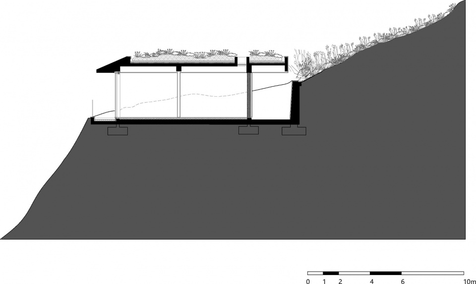 Perched at the highest point of the site, a washed stone-clad structure houses guest suites discreetly integrated beneath a lifted green landscape. From the exterior, the building is nearly invisible; from within, floor-to-ceiling windows frame tranquil mountain vistas.