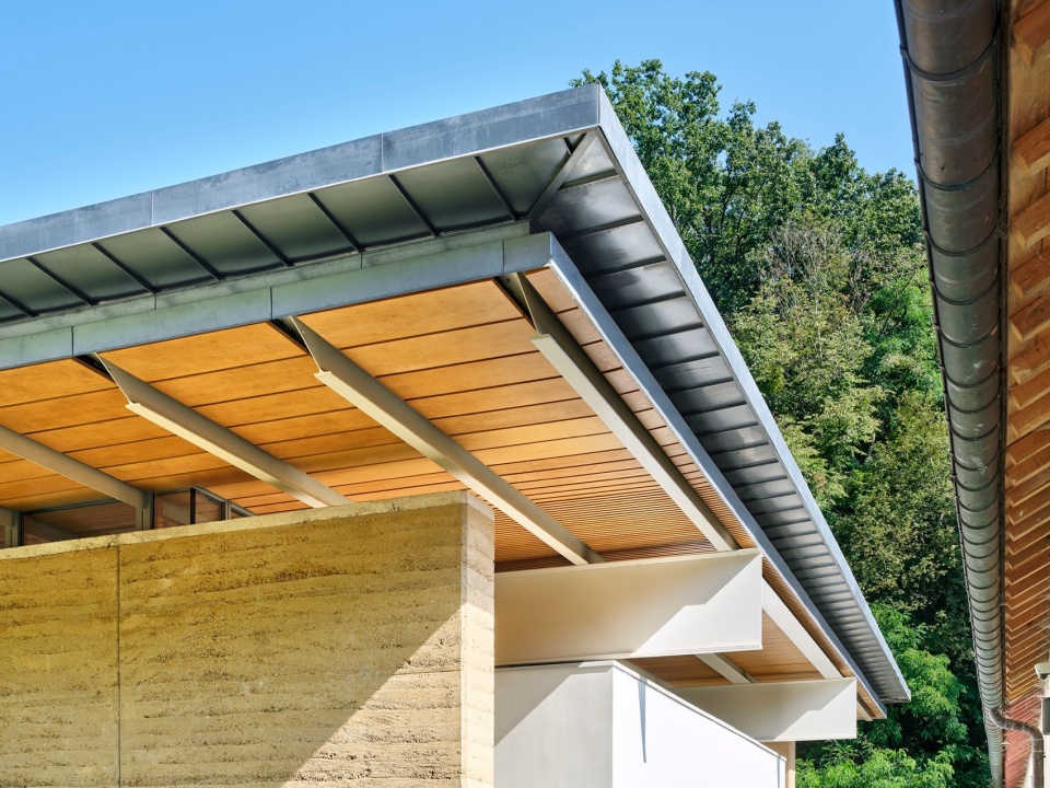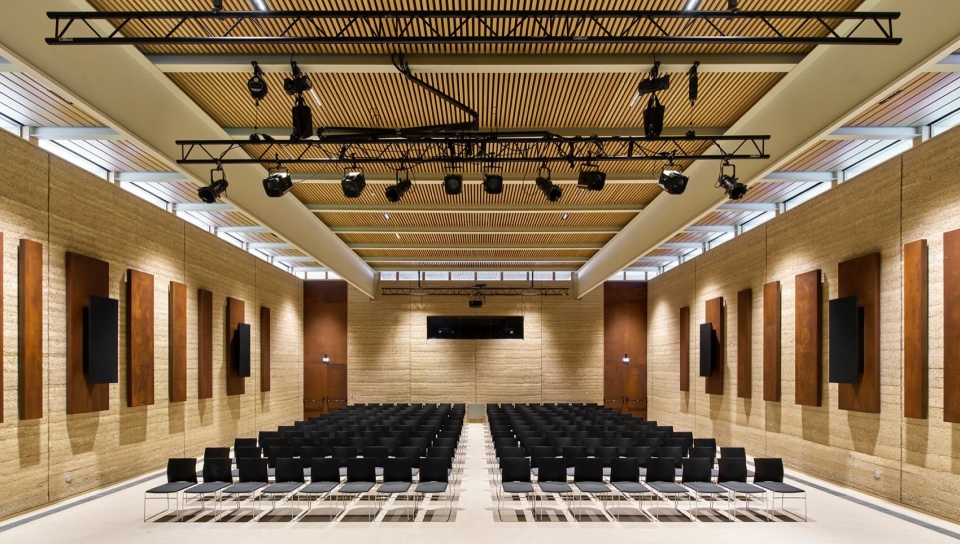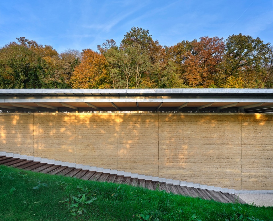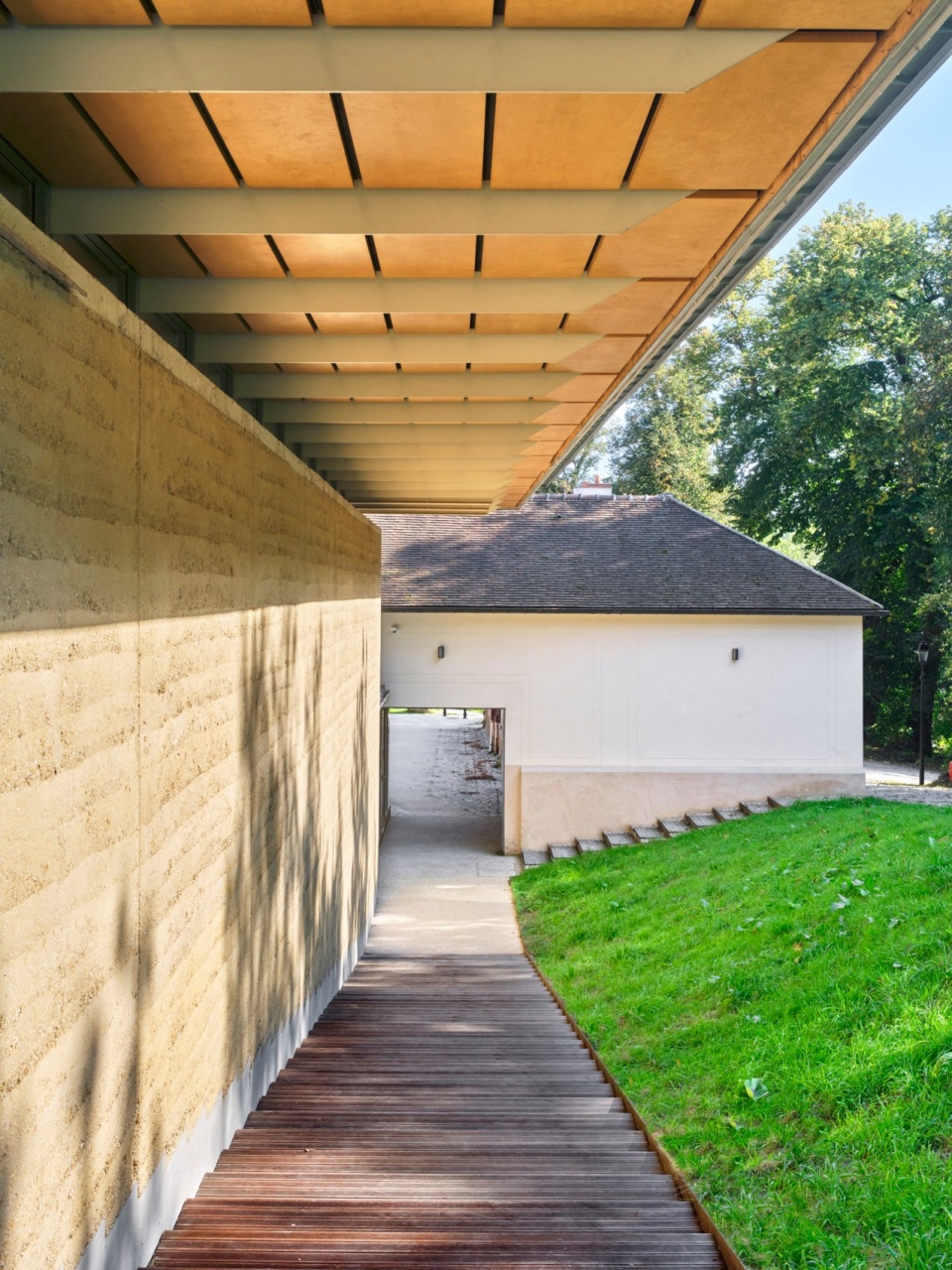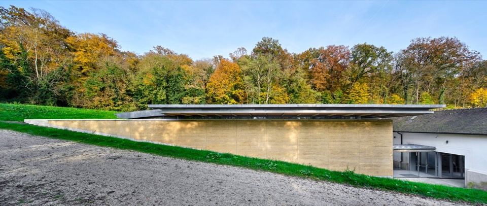 纵向墙体采用夯土结构进行设计与建造,仿佛将山体侧面切割开来,裸露出其内部结构,同时呈现出地质层理的剖面。还有什么材料能比取自场地自身的土壤更好地融入环境?这些土壤被层层夯筑,却未改变其原有的质感与色彩。承重的夯土墙体在室内一侧覆以一层厚度为 20 厘米的浇筑式麻混凝土内衬,该内衬保持外露状态,并通过嵌入其厚度之中的木制连接件固定在夯土墙体之上。