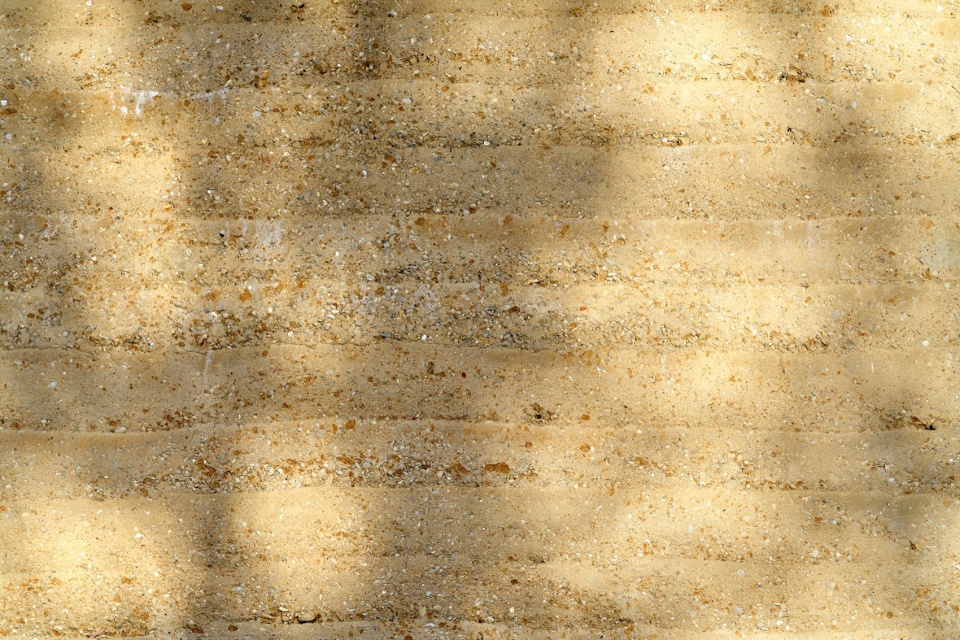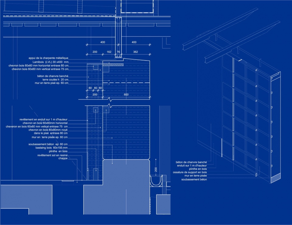 The longitudinal walls are designed and built with rammed earth, as if the side of the hill had been cut away, exposing its entrails, and thereby the stratigraphy of its geological layers as well. What material could have better integrated into the site than its own soil, worked into strata, without altering its texture or colour? The supporting rammed earth walls are lined on the inside with a 20cm-thick layer of poured hempcrete, left exposed and affixed to the rammed earth walls with wooden studs embedded in the thickness of this lining.