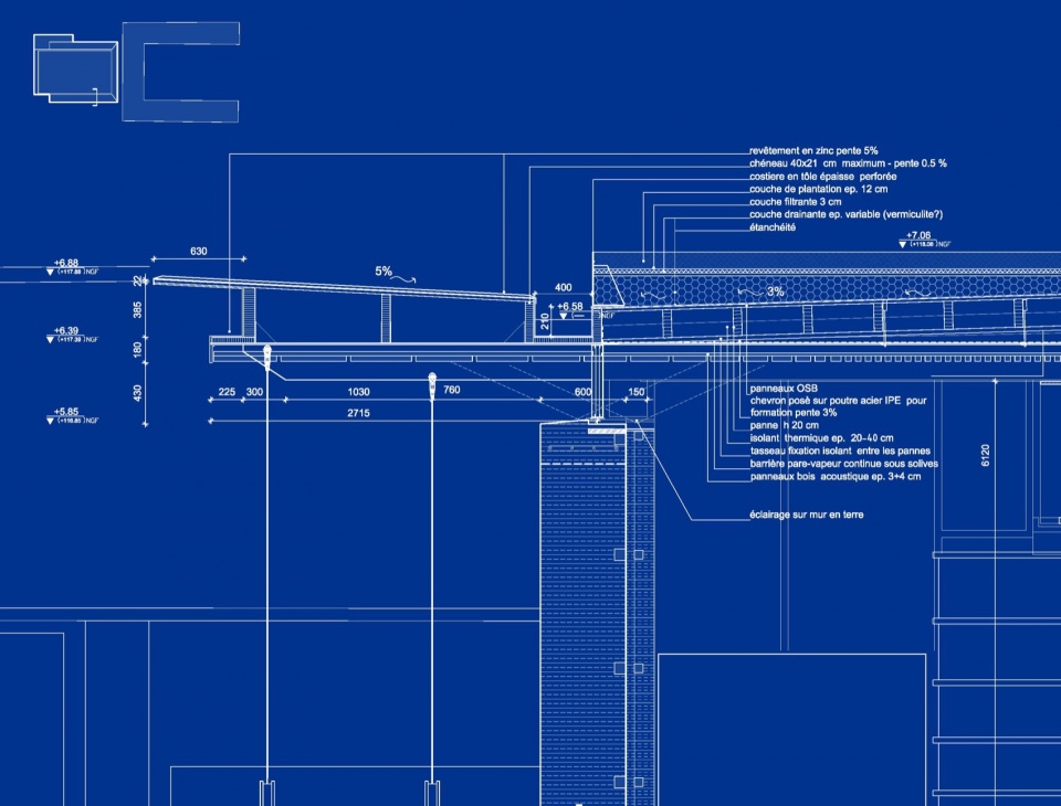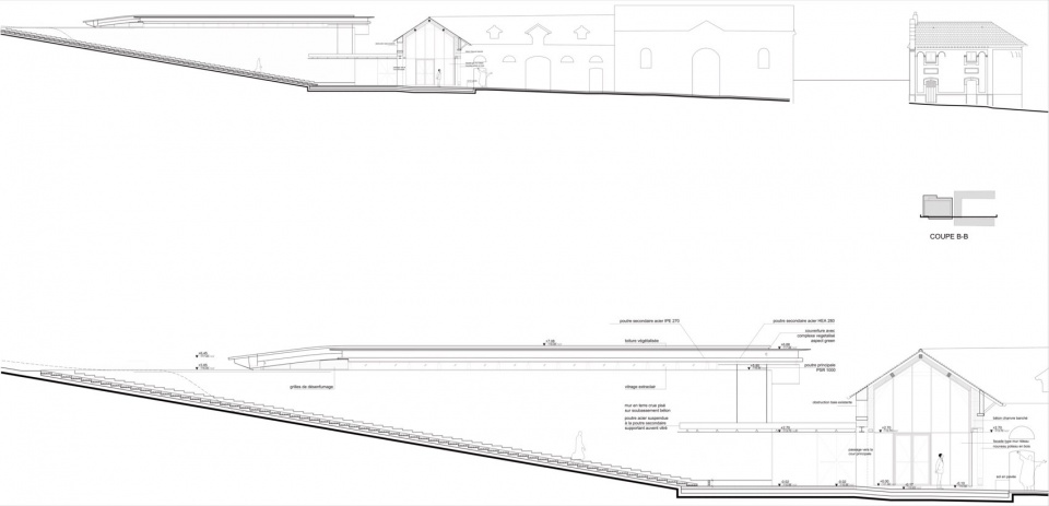 The project aim is discretion. It blends perfectly into the green surroundings. It exists in harmony alongside the service quarters of the château, which have their own charms. The new hall nestles into the slope of the terrain, discreetly covered by a green roof in continuity with the clearing. It is positioned on the axis of the building, respecting its symmetry.