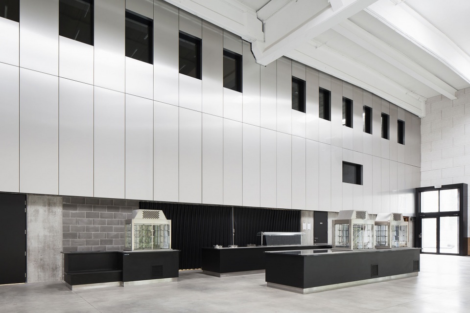 这座立面封闭、沉静的建筑曾位于庞大厂区的边缘地带,如今它必须承担起作为社区纽带的先锋角色。建筑东西两侧设有两扇巨大的木门,迎接周边居民与园区员工。仓库檐口之上加建的新体量采用反光金属包覆,呼应商业厨房常用的材料,这也象征着Bale仓库及整个厂址在城市中未来的新面貌。