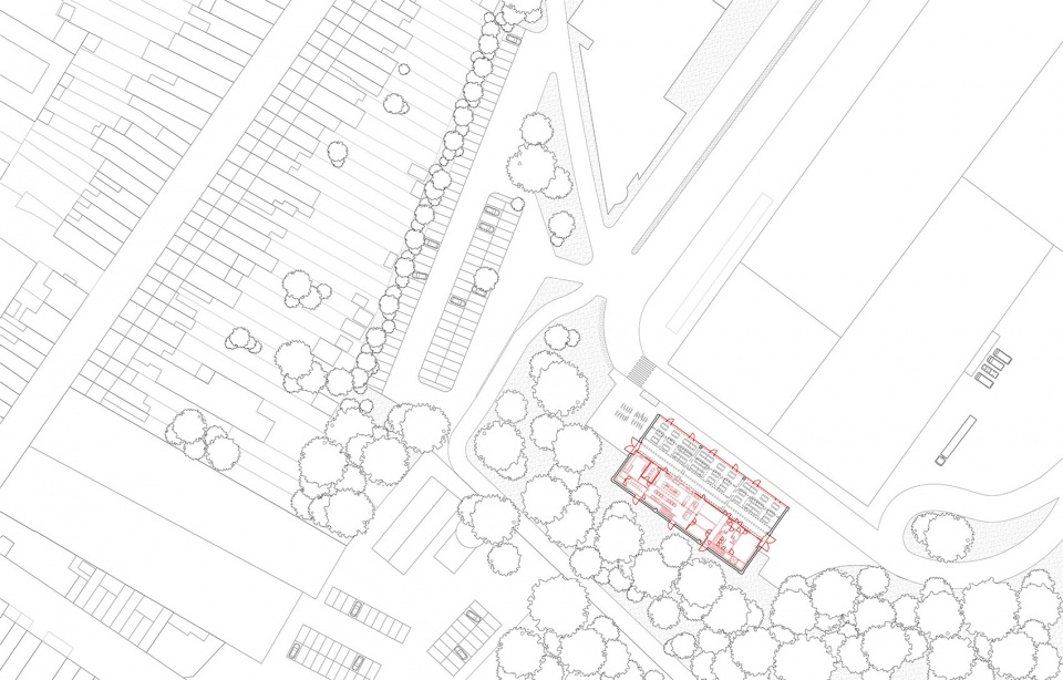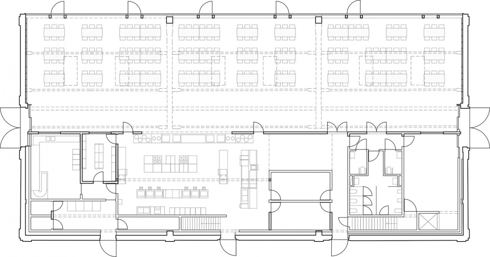 原有仓库本质上是一个具有预制混凝土结构、外覆精心砌筑砖壳的高大空间,三扇大门通向建筑内部。通过将新功能垂直布置于四层楼面,只占用了大厅面积的一半。因此,改造后的建筑由两个部分组成,可合并使用,也可独立运作。新建部分包含厨房、会议设施、就业中心及技术用房, 多功能空间与餐厅则继承了原仓库宽敞的高度与纵深。