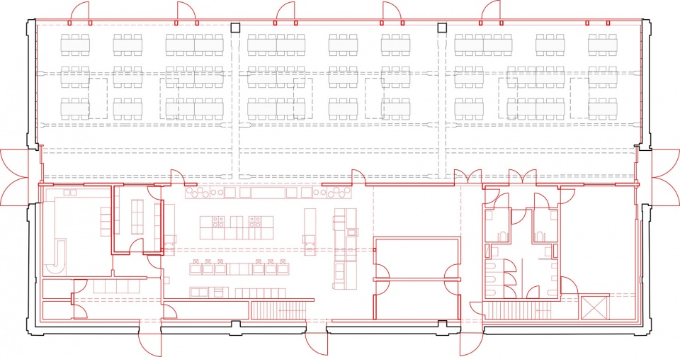 仓库结构简单而脆弱,因此尽量避免因新功能需求而对其结构进行改动,而是通过调整方案来消除改造的必要性。这一策略得以始终坚持,最终对原建筑的介入仅压缩为两项关键性的改动。南侧立面将完全打开,形成一条长形开口,面向正在UCO厂址上自北向南延展的新建公园。北侧立面则遮蔽了商业厨房生产所需的三扇门,通过砖与天然石材饰面将其巧妙融合。