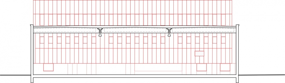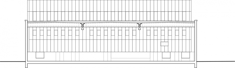 The constructive simplicity of the warehouse is fragile. Every modification necessitated by the new program is avoided by adjusting it in a way that eliminates the need for construction modifications.This strategy can be maintained, and ultimately the intervention on the existing building is reduced to two radical interventions.The southern facade will be completely opened up with a long, elongated façade that overlooks a park being developed from north to south on the UCO site. In the northern facade, three doors, essential for the production process of the commercial kitchen, are masked with a cladding of brick and natural stone.