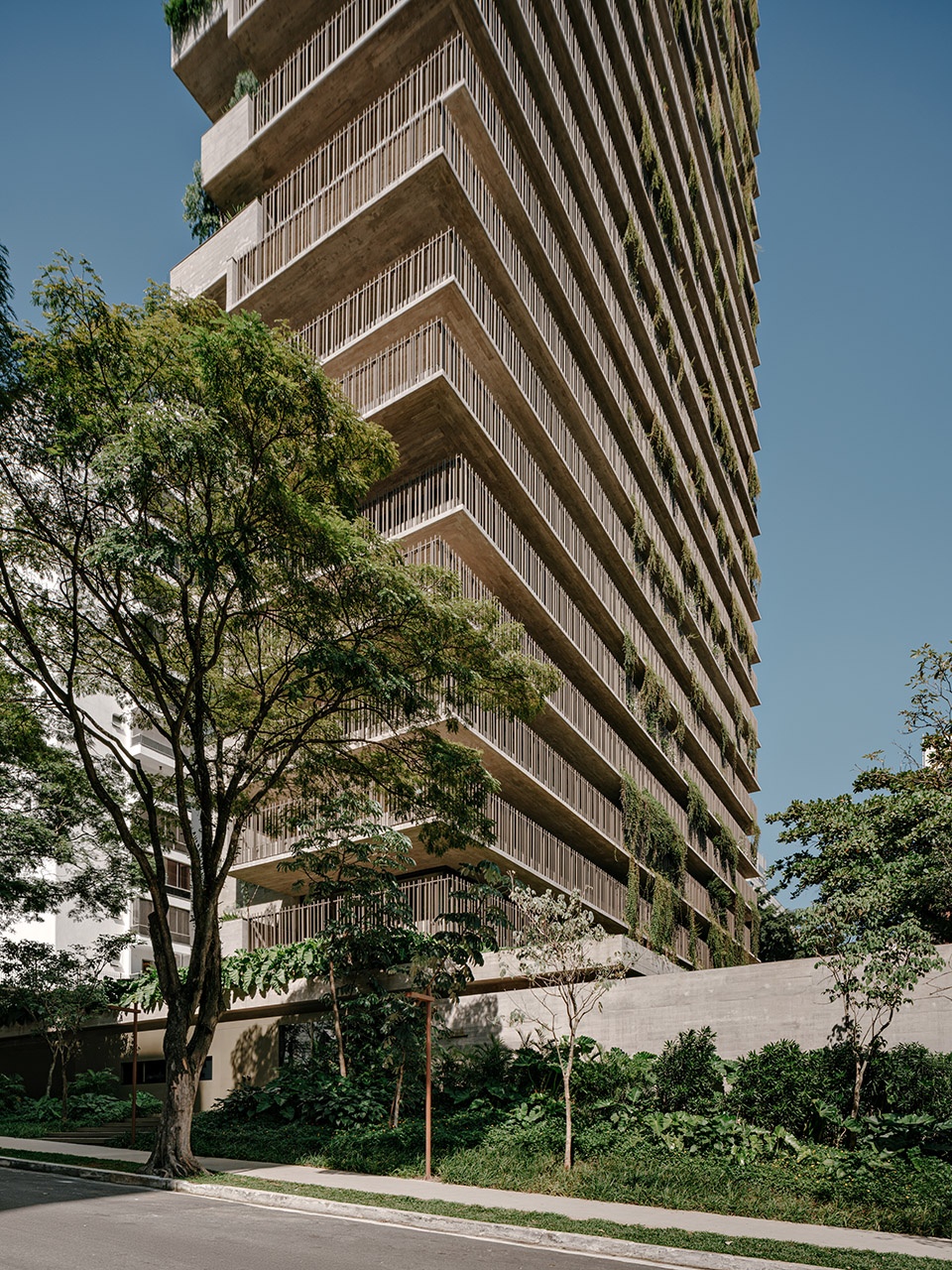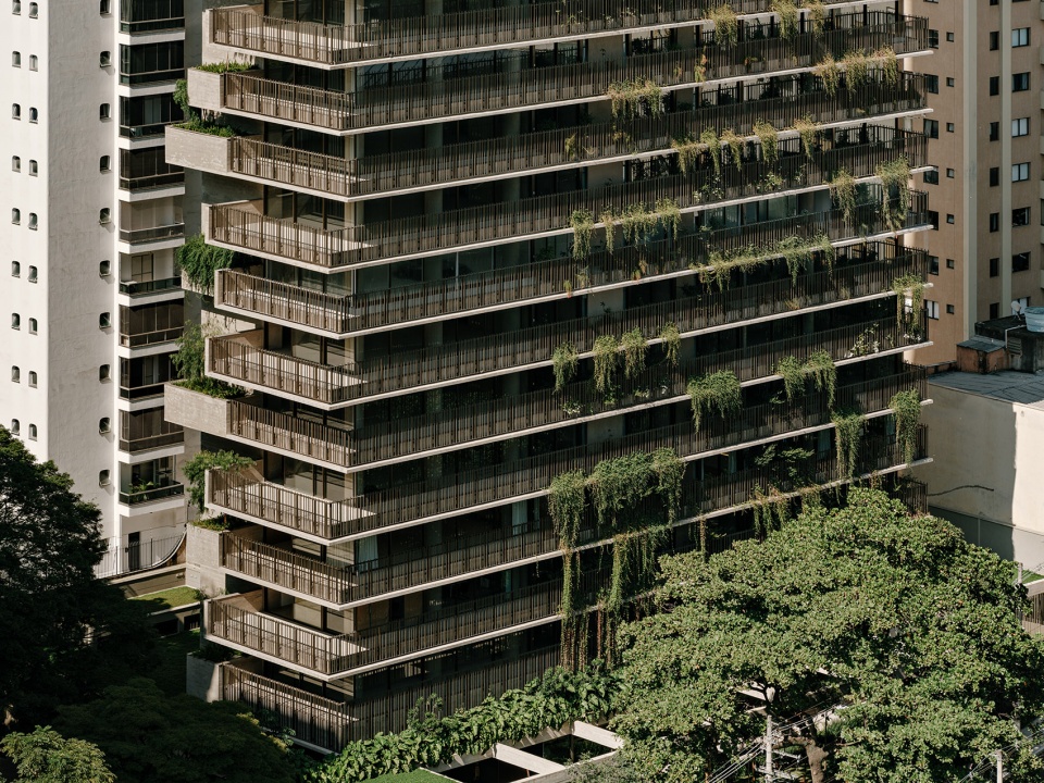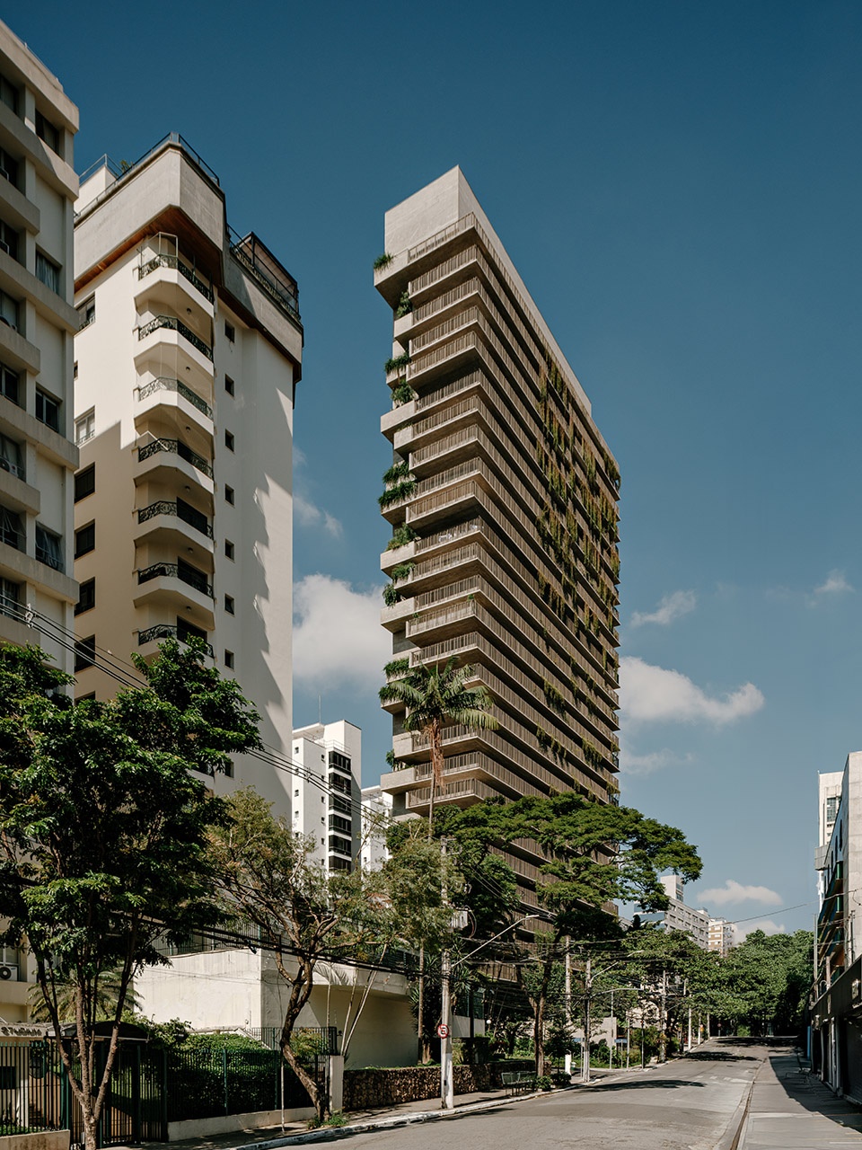 伊巴泰大厦(Ibaté Building)由Studio Arthur Casas为开发商Cáucaso设计,位于巴西圣保罗São Paulo的Vila Nova Conceição社区一处街角地块。该区域处于城市高密度发展轴线与安静、以住宅为主的城市肌理之间的过渡带。这一独特的城市条件成为场地决策与建筑与周边关系塑造的关键基础,使项目既能回应大都市的垂直尺度,也能融入社区温和、有序的生活节奏。设计策略以空间品质与城市融合为核心,强调结构的清晰表达、材料的理性使用,并通过公共空间的塑造提升整体居住体验。