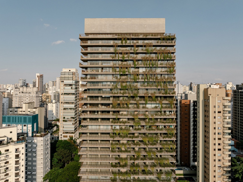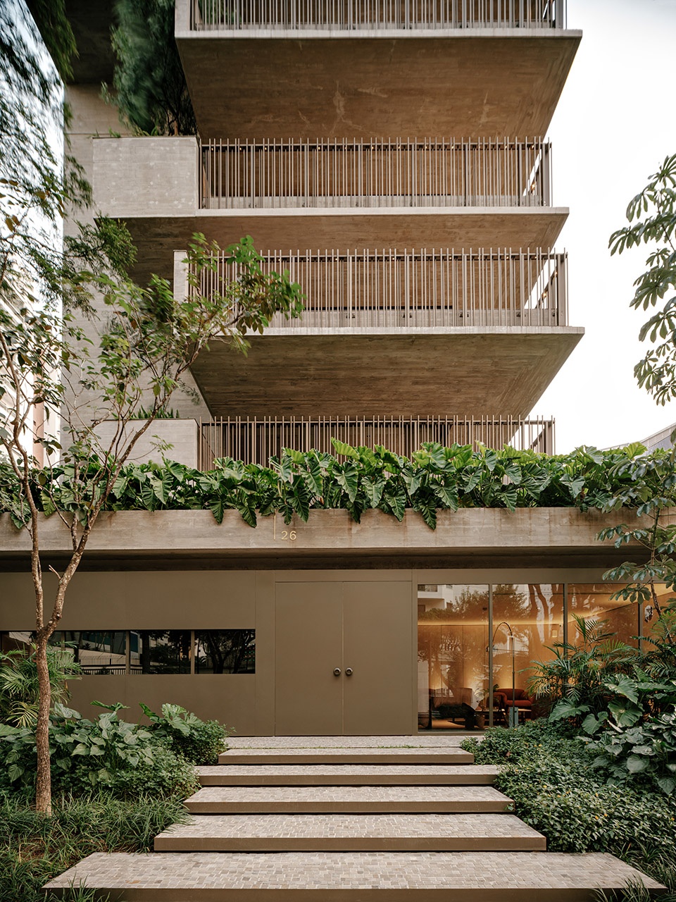 The Ibaté Building, designed by Studio Arthur Casas for the developer Cáucaso, is located on a corner lot in the Vila Nova Conceição neighborhood in São Paulo – a transition zone between the more densely built-up axis of the city and a residential, calm urban fabric. This urban condition was fundamental to the site’s decisions and the building’s relationship with its surroundings, allowing the project to engage both with the vertical scale of the metropolis and the gentler flows of the neighborhood. The design approach prioritizes spatial quality and integration with the urban environment, focusing on structural clarity, conscious use of materials, and enhancing common areas.