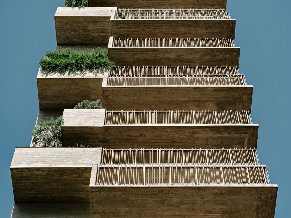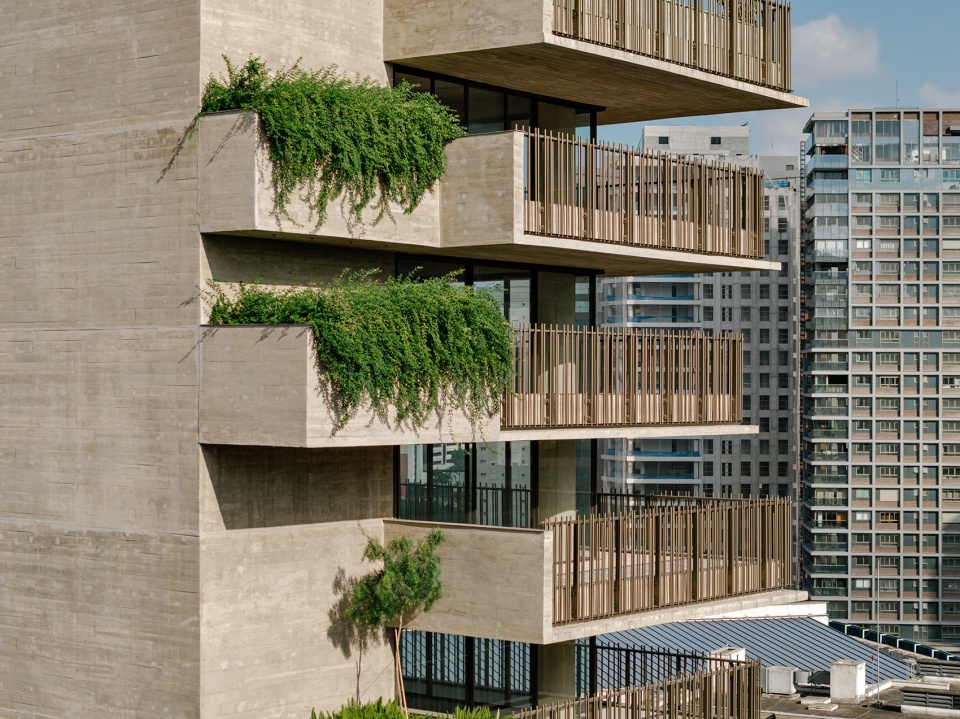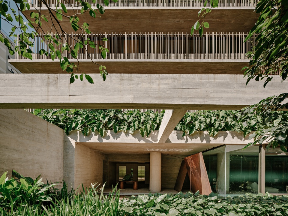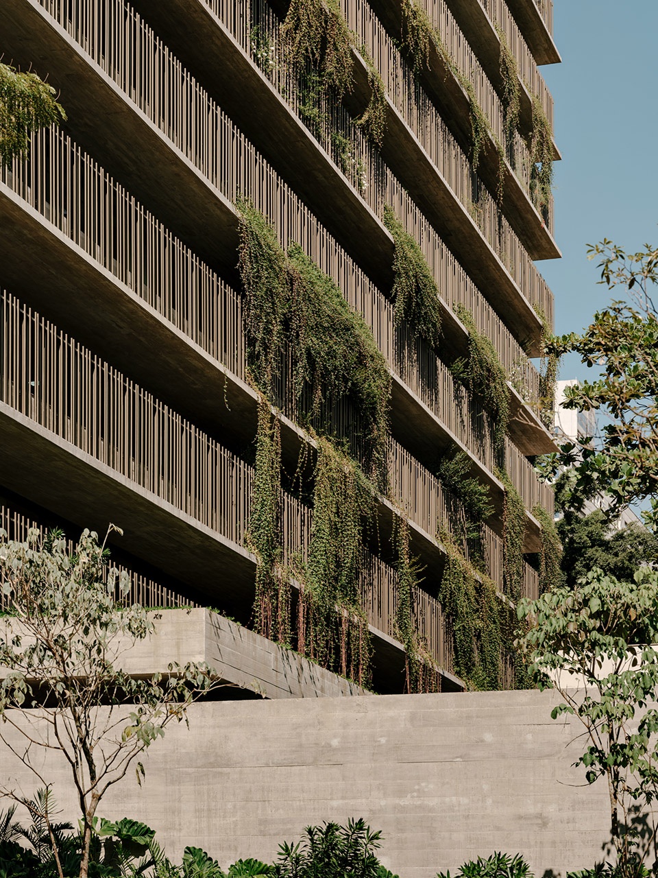 The building’s structure is fully exposed. The facades are made of structural concrete, without cladding. With a ribbed appearance and warm pigmentation, the material creates a solid, continuous visual identity, serving as a base for vertical landscaping, which is organically incorporated into the architecture and acts as a thermal and visual moderator.