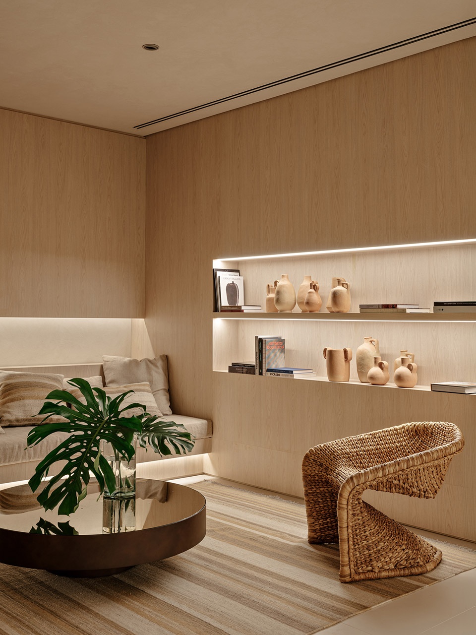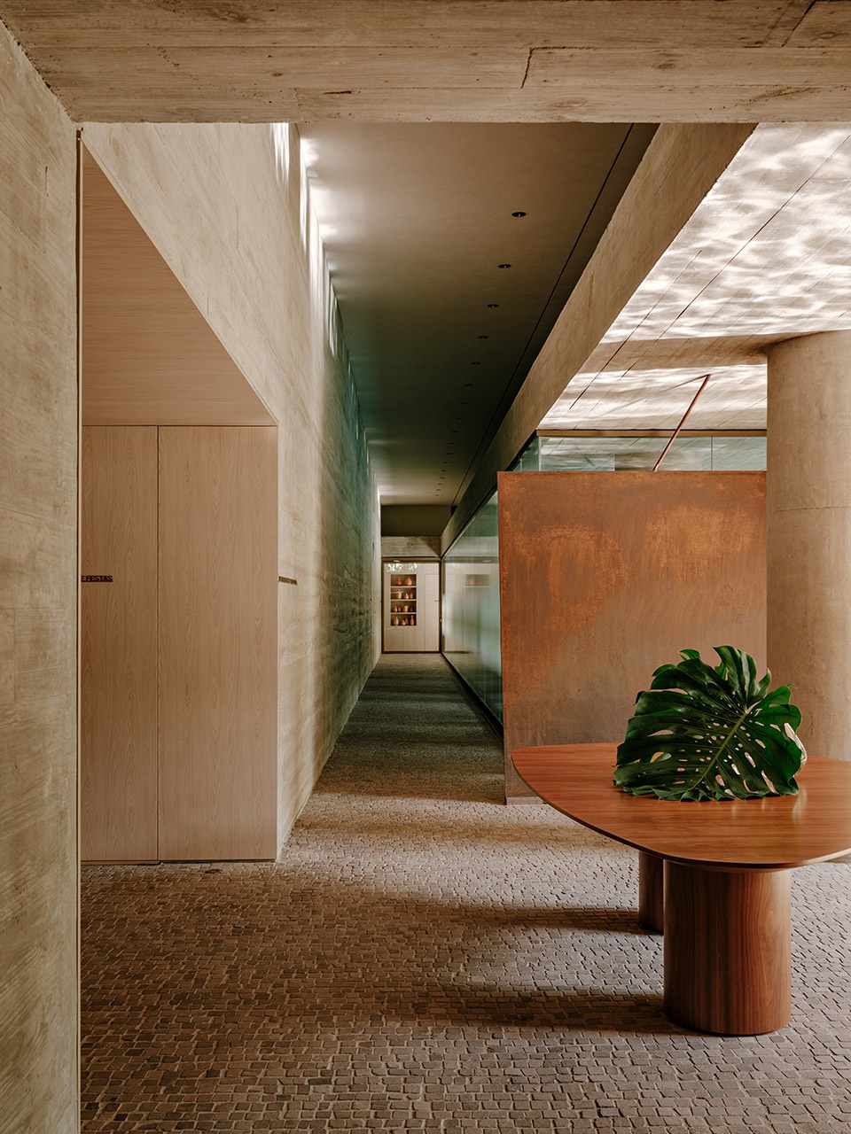 室内延续了整体材料语言,通过大量使用混凝土、木材、玻璃以及暖色金属,保持空间表达的连续性。木饰面被用来隐藏技术性门扇,并引导室内流线。家具陈设精选了多位巴西现代与当代设计师的经典作品,包括Jorge Zalszupin、Carlos Milan、Marcelo Magalhães、Guilherme Wentz、Lattoog以及Arthur Casas本人设计的作品。其中的亮点包括+55design出品的Soft扶手椅,以及Herança Cultural的Square餐桌。
