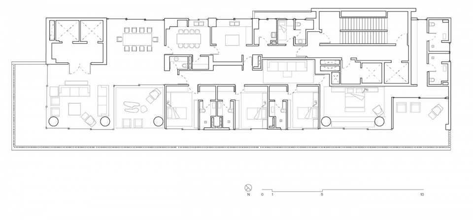 塔楼沿狭长地块纵向布置,标准层面积约为450平方米。每层仅设置一套住宅单元,清晰划分社交、私密与服务功能空间。垂直交通由两组电梯核心筒组织,所有住宅均实现对流通风,拥有面向室外的大尺度开口,并经过精细的日照朝向控制。正立面完全向连续露台打开,每户单元均设置环绕式外廊,并配置花槽。花槽在不同楼层交错变化,避免立面的机械重复,同时引入体量层次变化与自然遮阳效果。铝制栏杆配以黄铜色表面处理,并结合大面积玻璃窗,共同构成建筑的外立面体系。