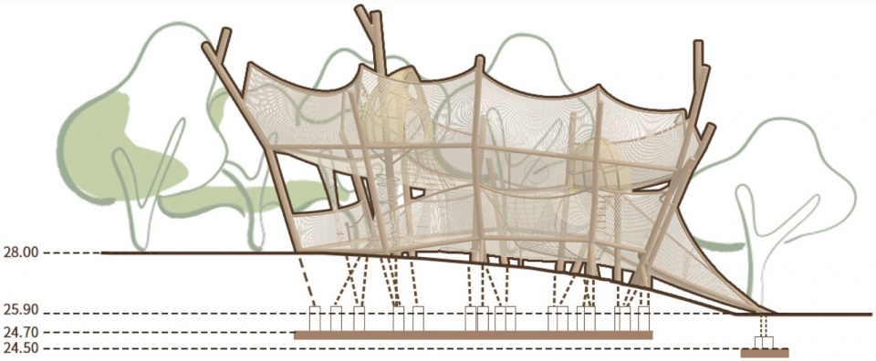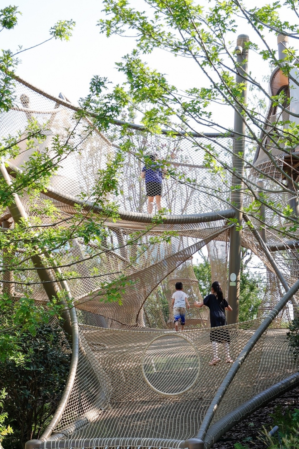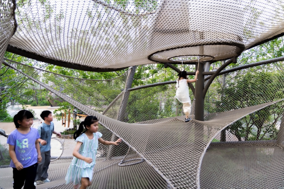 水杉快速生长,将树干的木质结构放大千百倍,交错的纤维结构如同层叠大网。在网床上蹦蹦跳跳触摸树梢,或是躺树荫里做一个美梦,家长和孩子们一起,在树冠的环抱间感受自然的美好。