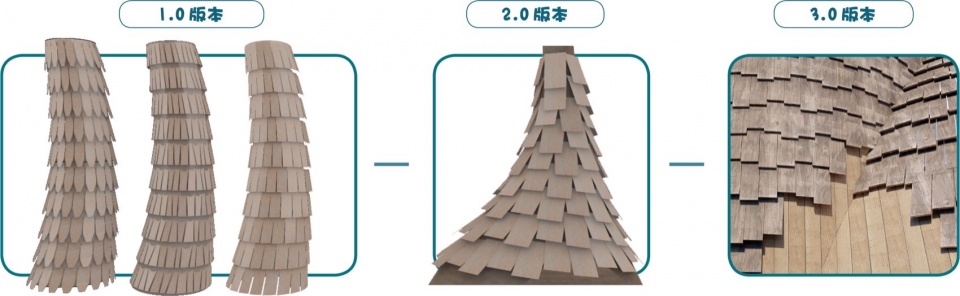 为生动再现水杉根系的自然形态,奇妙森林区的三座主塔采用偏心锥状结构,包含多处不同的树干转折、枝桠夹角与仿生树洞。表皮设计精准模拟斑驳皲裂的树皮质感:经多轮模拟,选定参差层叠的表皮模块组合方式,并研发了一套Grasshopper电池组,依托参数化设计精确控制生产安装精度。