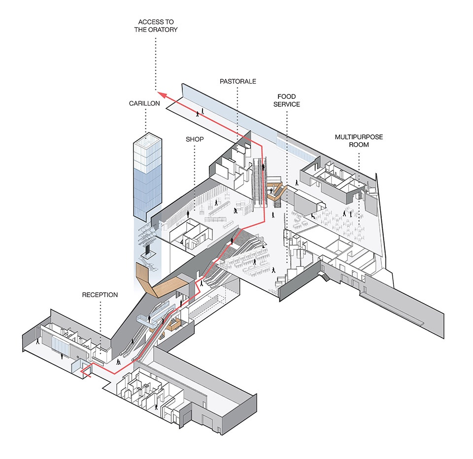 自建成以来,圣若瑟大殿始终是一座信仰与沉思的灯塔,是建筑与虔敬精神交汇的圣所。此次新增建筑作为自 2000 年启动的总体规划的一部分,标志着一次深刻的演进——在尊重历史遗产的同时,回应面向未来的愿景。从访客抵达的那一刻起,便被引导进入一系列精心编排的空间序列之中,重新诠释朝圣体验,使穿行于场地的过程本身成为一场探索之旅。