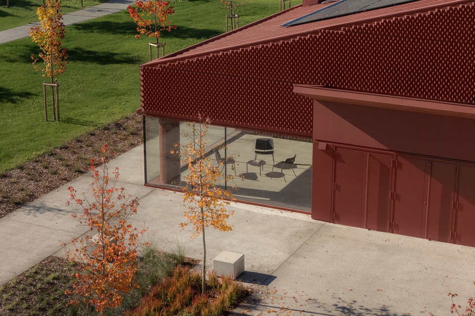 The landscape design continues the dialogue with the adjacent park, using native species that reflect seasonal cycles and strengthen the connection between architecture and nature.