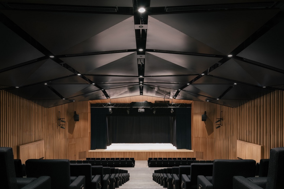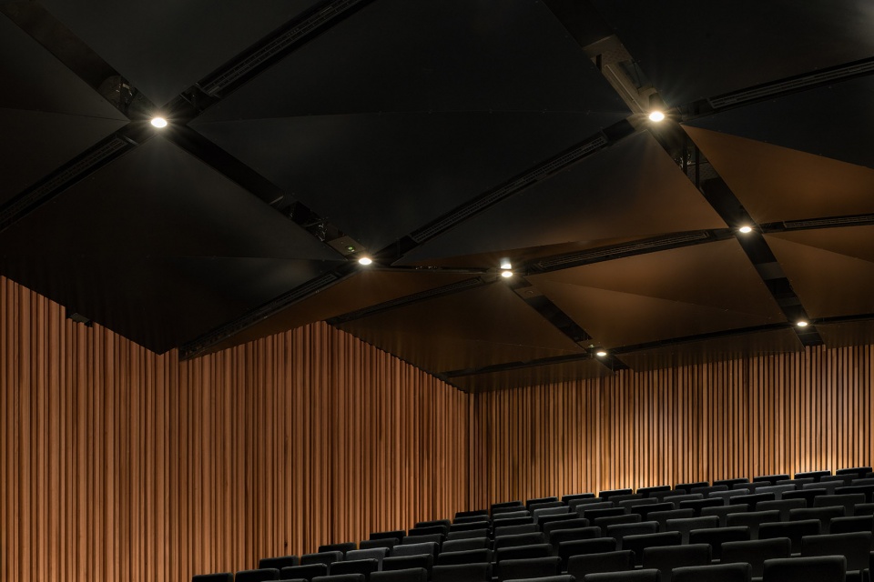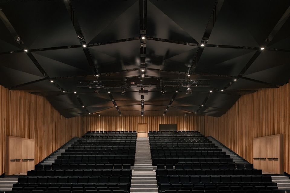 作为省内规模最大的剧院之一,该礼堂被设计为可承载多种表演艺术形式。精心调校的声学系统与灵活的舞台机械,使演出既可面向室内,也可朝向室外展开。内部空间以郁金香木饰面包覆,其材料与构图节奏共同营造出一种当代而温暖、亲切的空间气质。