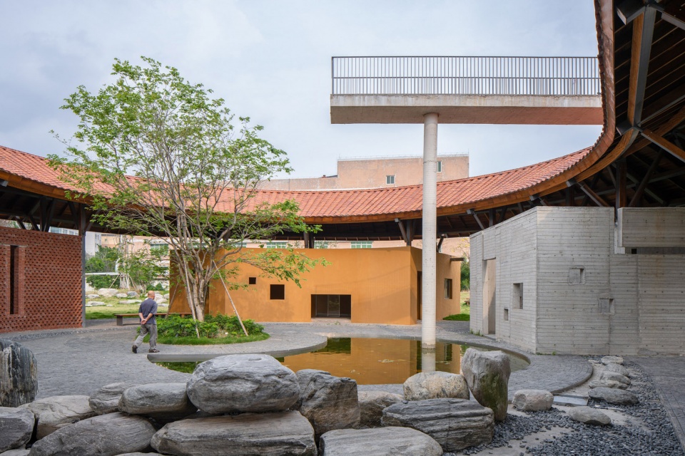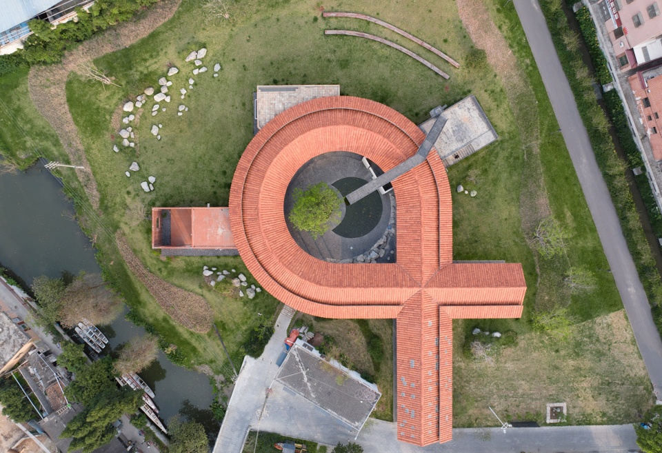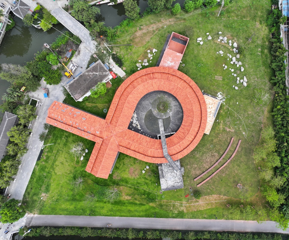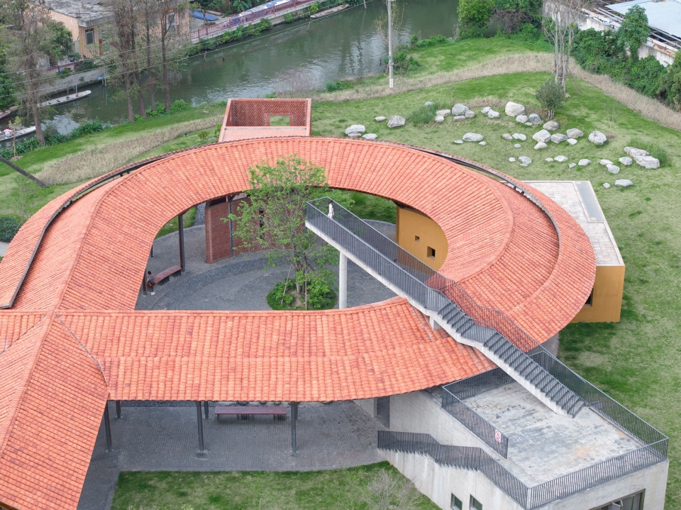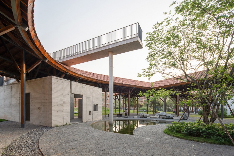 The architectural space is composed of an interwoven system of a corridor and three landscape structures, each defined by a distinct material expression. Local materials and construction methods are translated into a contemporary architectural language:Perforated red-brick masonry forms a semi-permeable and breathing skin. Rammed-earth walls reveal a primordial warmth and texture. Timber-textured fair-faced concrete is sculpted into geometric volumes and expansive cantilevered platforms. Terracotta tiles crown the steel-timber corridor, deeply rooting the architecture in the material fabric of the site. Positioned in response to the existing waterways, trees, mounds, vegetable plots, and old structures, the three volumes become “viewfinders” that frame curated vistas, capturing diverse scenes of the surrounding landscape.
