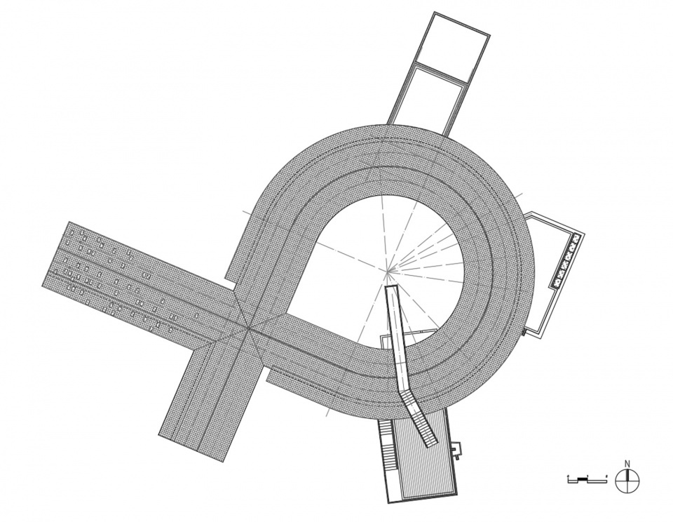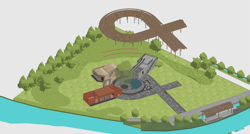 老龙公园项目的核心理念凝练为 “新龙望老龙”——并非形式上的模仿,而是一场关于精神、记忆与材料的抽象对话。将593年的历史与传说,转译为一条 “空间化的廊道” ,其延伸的轨迹指向 “藏龙点” 老龙舟的栖身之所。动线构成了整个项目的叙事轴线与精神纽带。