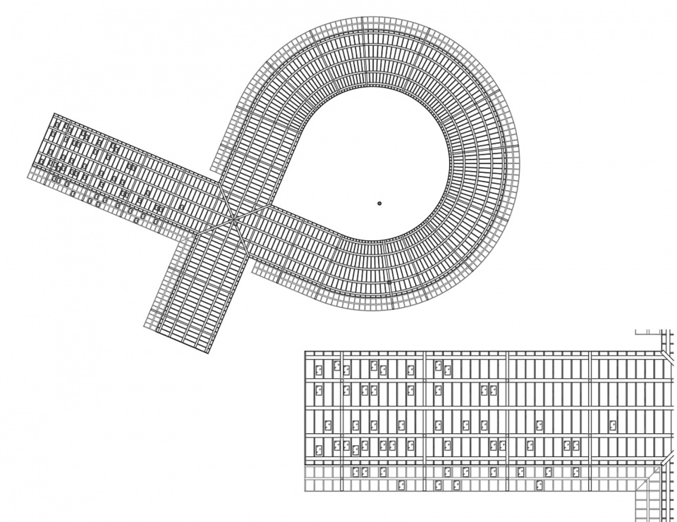 连续的架空廊道系统,不仅是“新龙望老龙”的意象连接,在功能上创造了可适应岭南炎热潮湿气候的阴影灰空间。这些空间序列( ⅓ 实体、 ⅓ 半虚、 ⅓ 全虚)鼓励自然通风与光影互动,使建筑本身成为一个会“呼吸”、可调节的生态界面,直接服务于人的舒适与活动。打造根据不断变化需求与条件进行调整的“柔性建筑”。