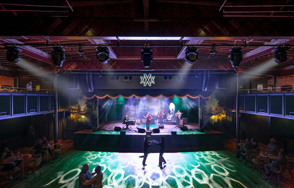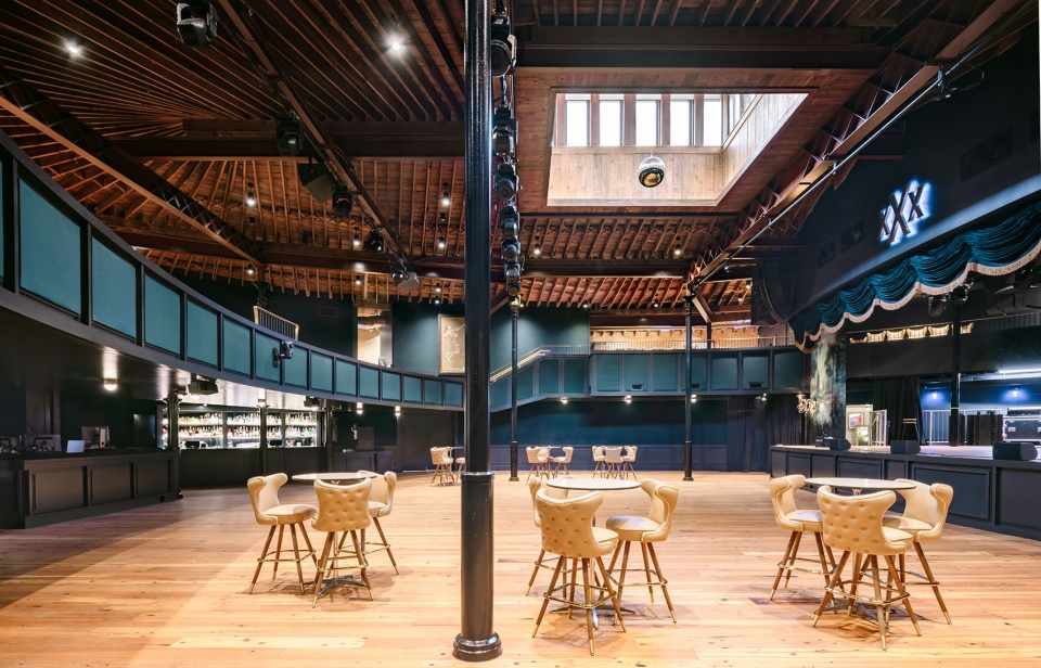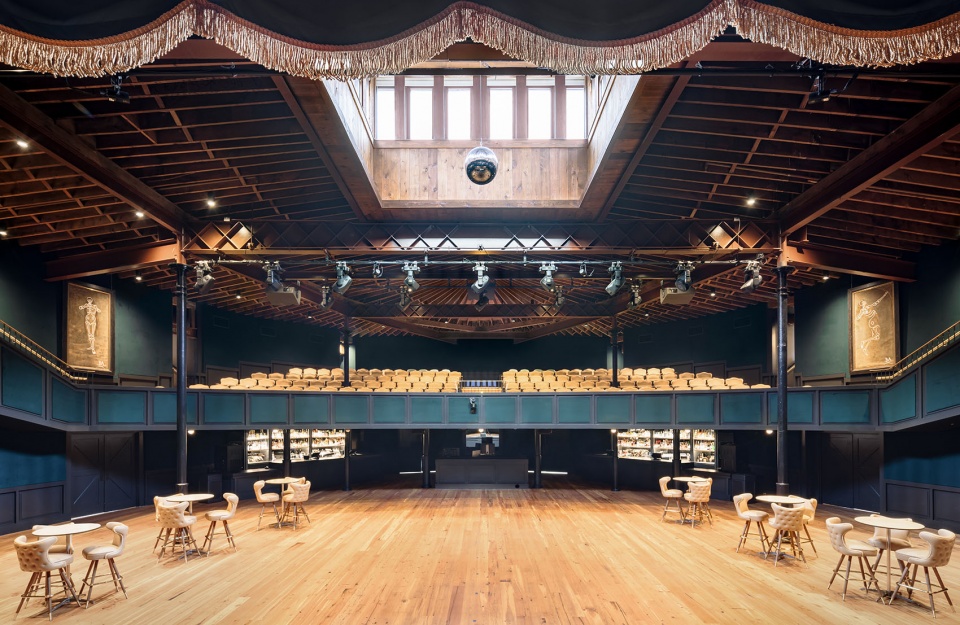 场地内放射状铺设的原始木质天花,是对 19 世纪 90 年代工匠技艺的有力致敬。定制软包的阳台座椅与位于上层的休息区——被称为东、西两侧的“干草阁楼”(hay lofts)——与宽敞开放的一层空间协同运作,使场地既能容纳热烈的站席演出,也能灵活转换为更为私密的坐席活动。