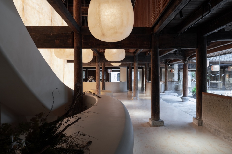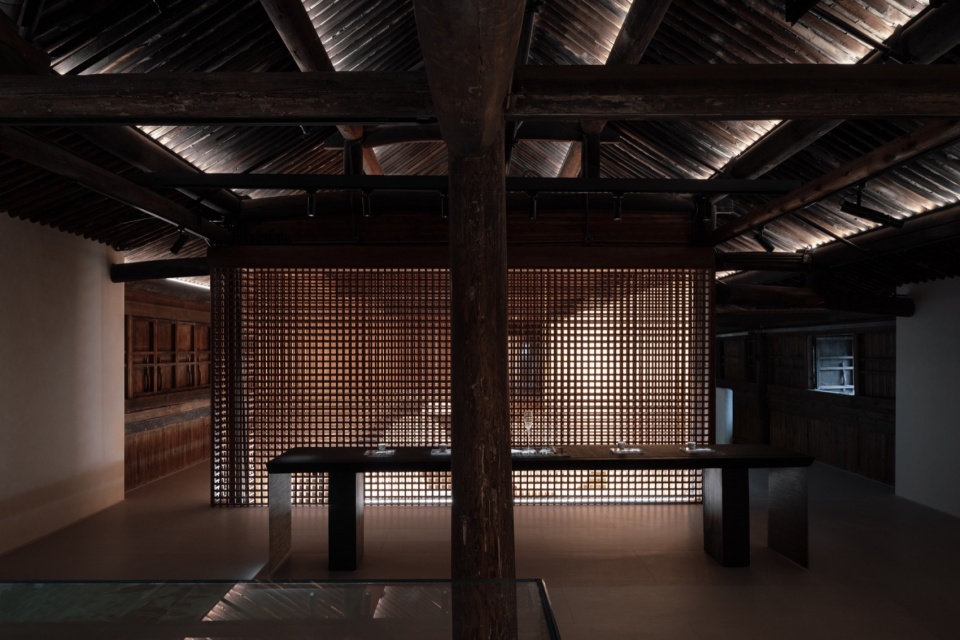 入口处两厢门房被改造为氛围独到的茶室。庭院东西北三方位的原本的木门与窗扇被拆除只留下石头墙板,檐廊被玻璃幕墙围入,成为室内与的通行与展示空间,室内空间因此向庭院外扩与延展。为了创造新的地坪界面和增加净高,室内原本的石板地面被拆除,浇筑混凝土后以细颗粒的米色水磨石作为最终的完成面,部分石板也被利用回填至庭院与檐廊中部分因年久失修而损坏开裂的石板地面。