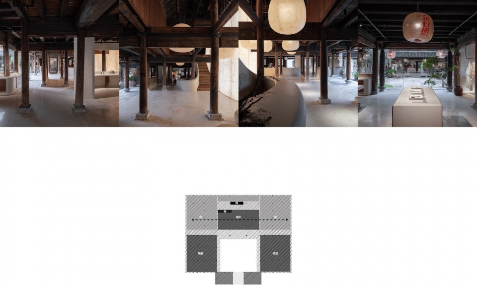 位于葭沚老街的周家里是一座江南传统三开间大院落的历史建筑,以七开间的主屋为合院核心,由两横屋(厢房)与倒座(单层门房)共同围合而成完整体量,中央为四方道地景观石庭,形成堂-横式空间布局,歇山顶与硬山顶相结合,四面皆有披檐。吴语区的台州片区的风土民居院落尺度较大,本身也适合转换为公共空间或商业场所。二层一般为储藏空间,也可为居住功能,“堂前”正中上方一间通常为仪式空间。设计团队在充分理解浙江民居的空间脉络的基础之上,针对新主题的提出,在保留原始木结构的限制条件下,寻找合适的改造策略。