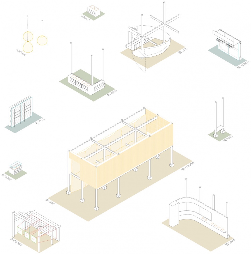 台绣中独具匠心的工艺,如拉、雕、镂、透、包、绕、贴、抽、镶等手法,也经由设计在空间中的转译,成为了介入并实现改造的有效手段。台绣院通过一种向内的整体设计思路,以较高的比例将空间改造、室内材料、家具陈设、细部物件、景观界面等都包涵在了定制化的设计控制之中,与业主共同完成设计与落地。无论是半透明的墙体材料还是造型各异的灯具,亦或是嵌入式的家具,还是自然形态弯折的悬挂衣架,都没有使用标准化的成品,夹丝玻璃中特定孔隙率与色泽的棉麻也由业主专门选择和制作。这也使得项目表达出自成体系的一致性。