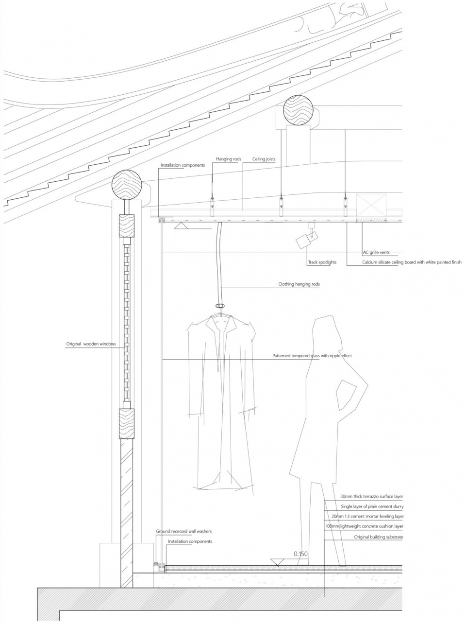 一楼室内以大面积暖白色水磨石地面和沉淀的木色为基调,烘托出相宜又新旧并置的物与情境关系。定制化的设计贴合原生的结构,以柔和细润的形式介入,适当的创造出分区的节奏,又满足品牌展示与综合的功能需求。夹丝水纹玻璃紧靠原墙面设立,既成为悬挂服装的背景,又能透出背后老砖石的历史痕迹。