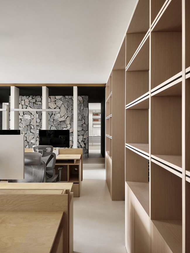 Six sets of partitions guide the flow between functional zones, enhancing the sense of order in the circulation paths while creating structured plays of light and shadow. The work area rests quietly to the left of the corridor. It is no longer merely a container for tasks but is gradually becoming a stage for social interaction and emotional flow. Through the texture of materials and the logic of space, the designers foster an open and inclusive atmosphere that encourages deep dialogue and natural collaboration. This is an interactive field allowing freedom of movement. Complete and independent circulation paths enable thoughts to collide without boundaries, and allow individuals to choose their place intuitively and adapt their mode of work to the situation.