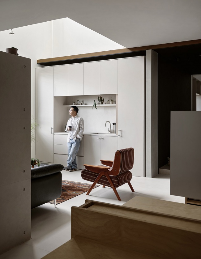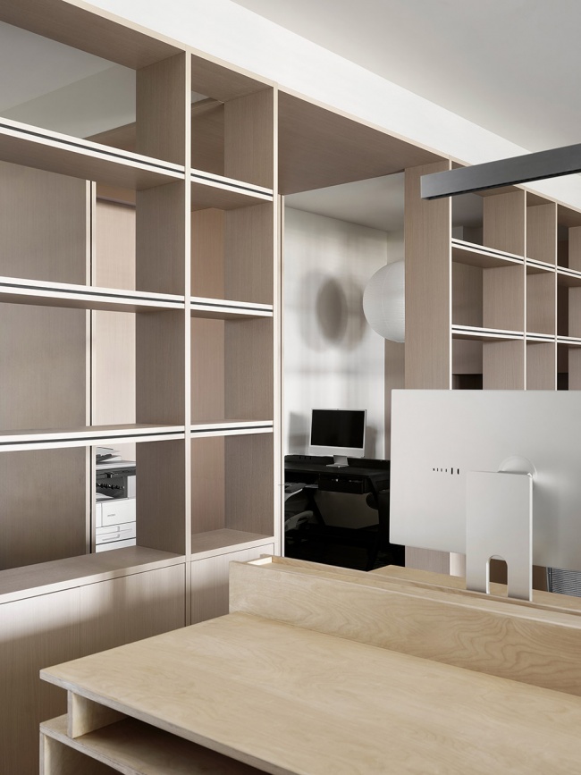 通过六组隔断对功能区进行分流,加强通道的秩序感,同时产生有序的光影。办公区静落于长廊左侧,这里不仅是工作的容器,更逐渐成为社交与情感流动的舞台。设计师借由材料的质感与空间的逻辑,营造出开放而包容的氛围,鼓励深度对话与自然协作。这是一种具备自由度的互动场域,完整独立的动线,让思维得以无界碰撞,人也得以依心择位,随境而作。
