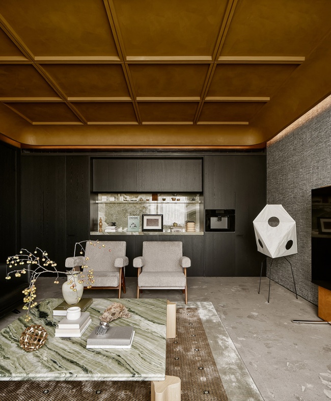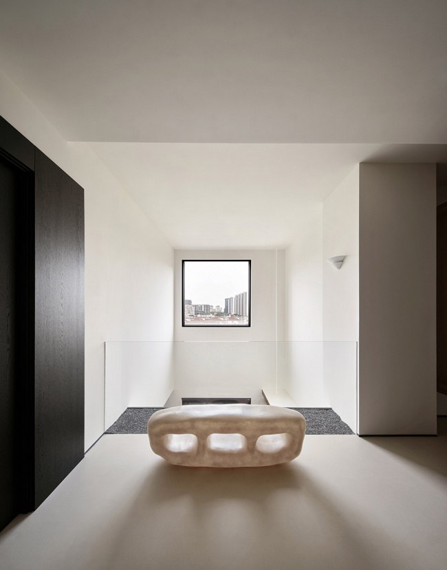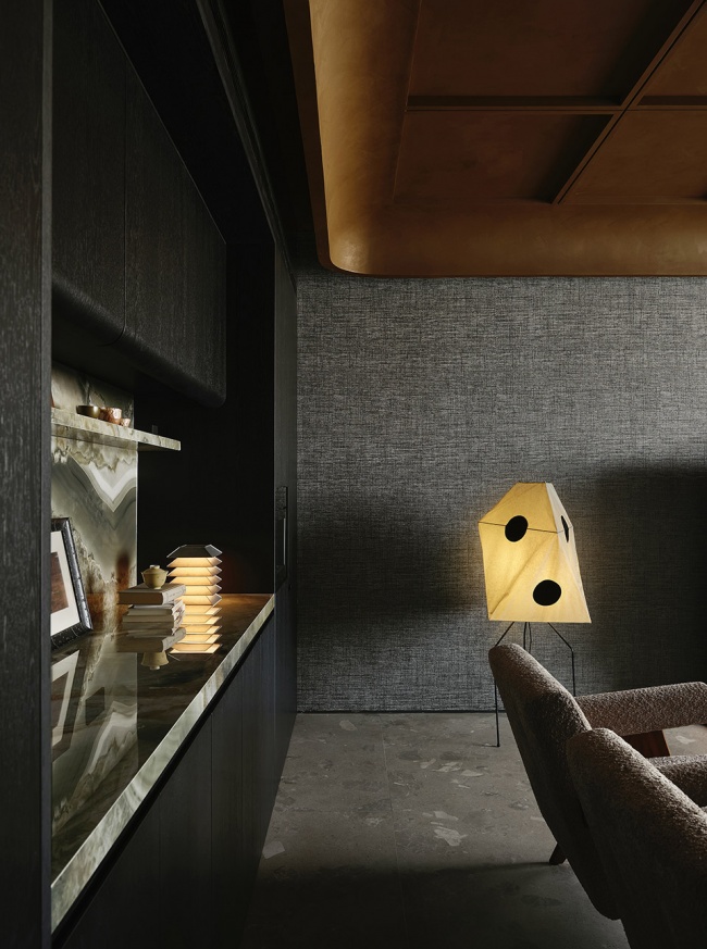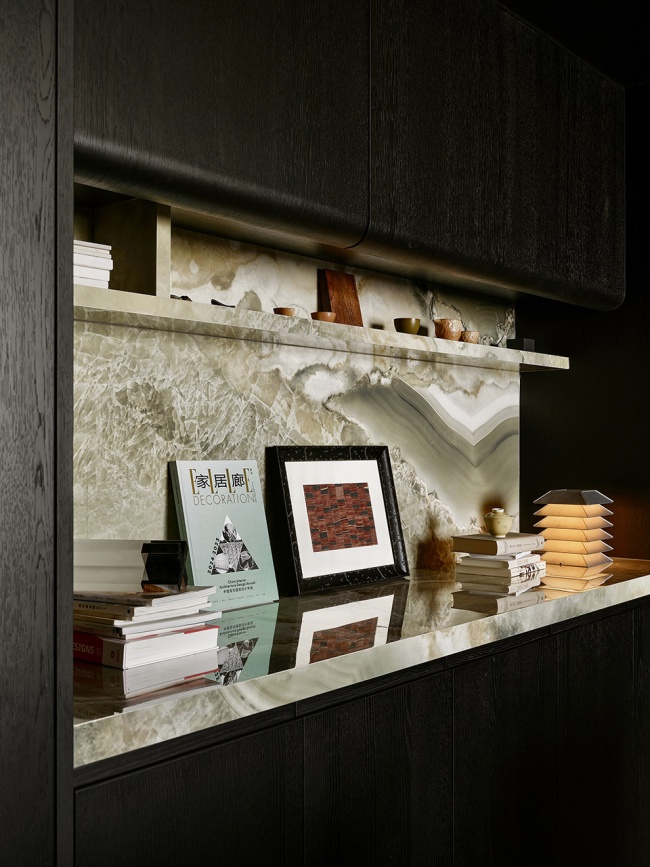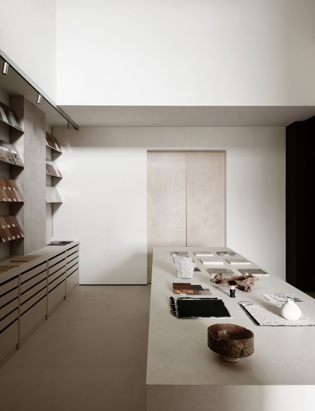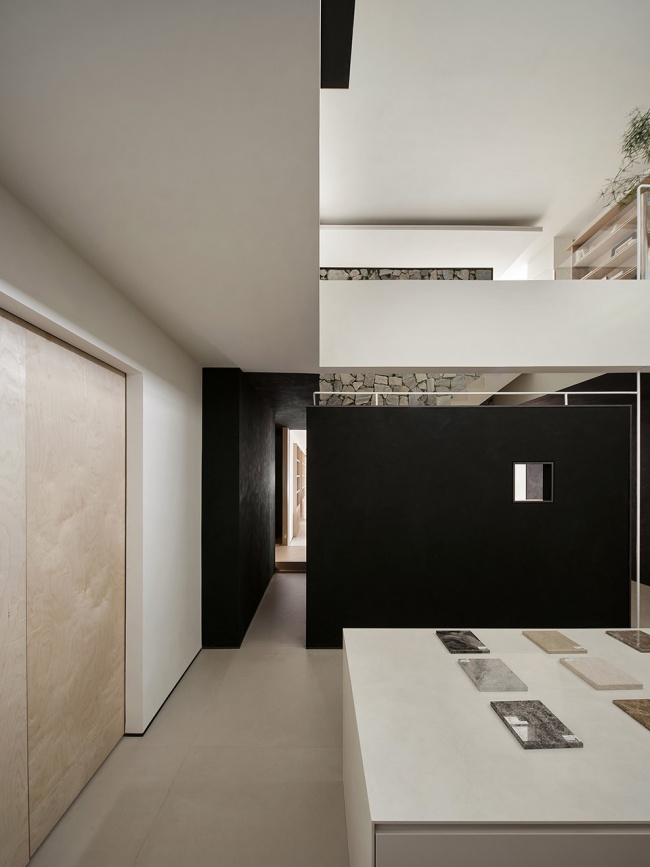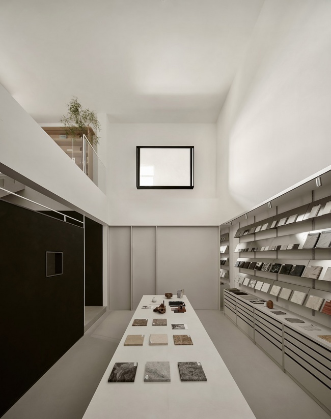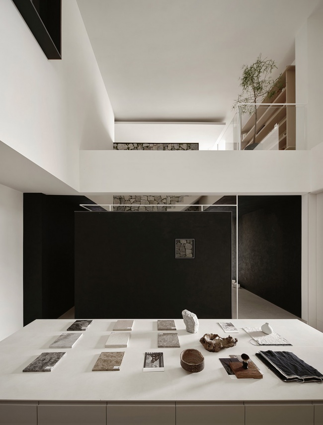 这里被定义为“灵感室”,是设计发生的原点。空间以挑空之姿向上延伸,两侧墙面的方形视口如几何画框,将自然光裁剪成片,倾泻而入。光线沿材质表面流动,掠过石材的冷峻、织物的柔软、木质的温润,以及金属的锐利。它们并非静默陈列,而是在光的作用下彼此对话,形成一场关于触觉与视觉的叙事。