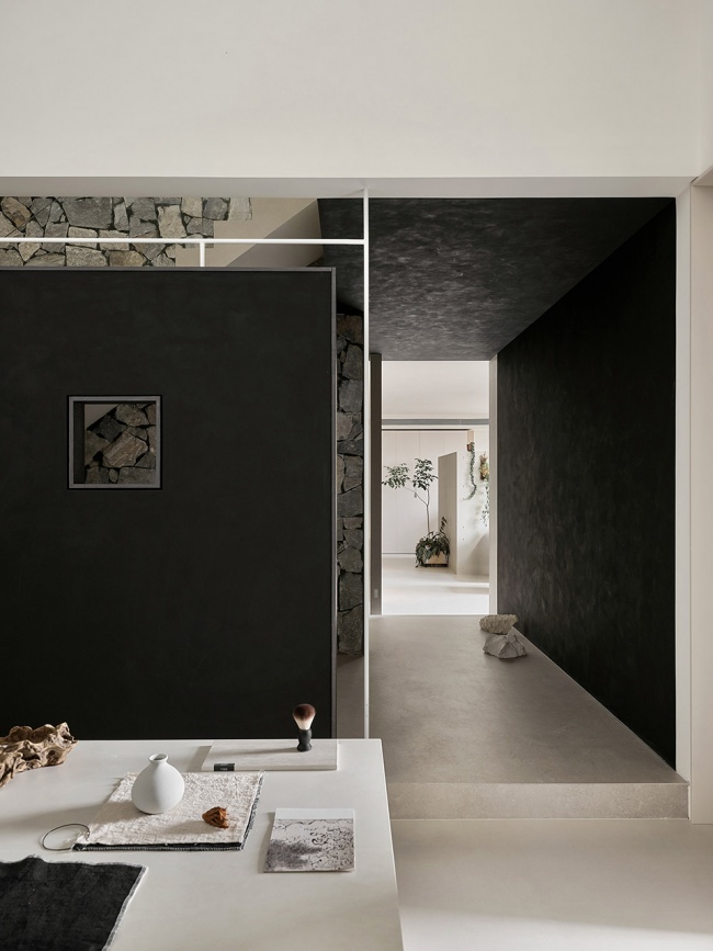 门厅,是空间的序幕。入室之初,黑色墙面与顶面沉静围合,一束光,静落在品牌标识上。“犹抱琵琶半遮面”,长廊如一首渐进的序曲,将故事的层次温柔铺展。无论时代如何更迭,人对于自然的向往始终深植于心,身处繁华,却依然渴望林间的鸟语、石边的水声。我们将山石、林木的意象纳入室内,一面粗砺的石墙,带着原始与随性的气息,悄然安顿每一份穿梭于都市的灵魂。