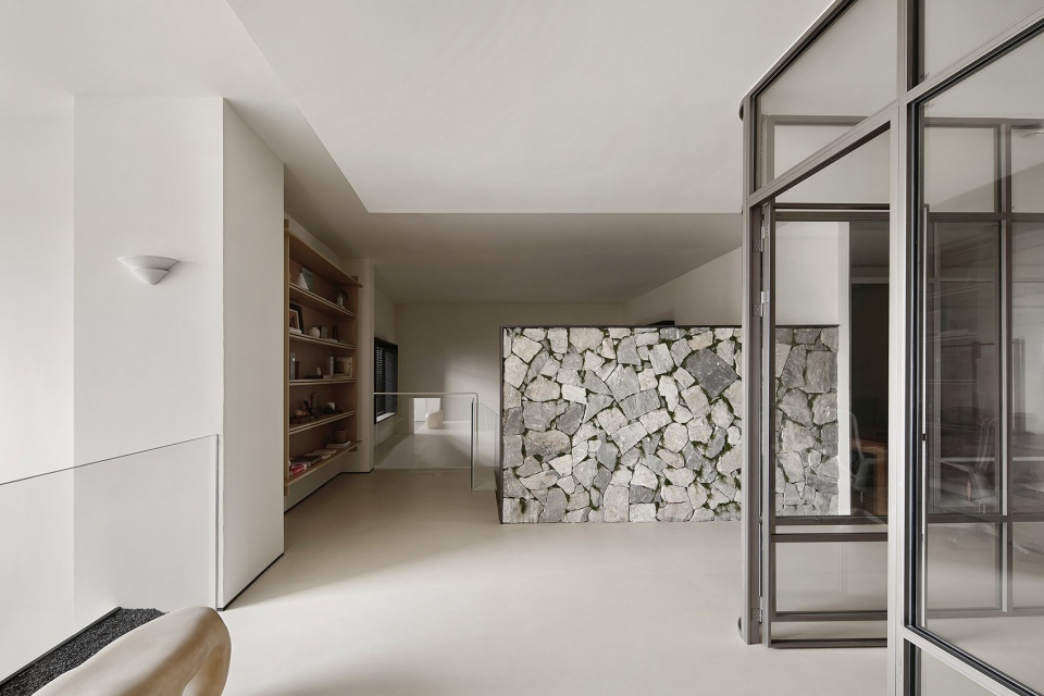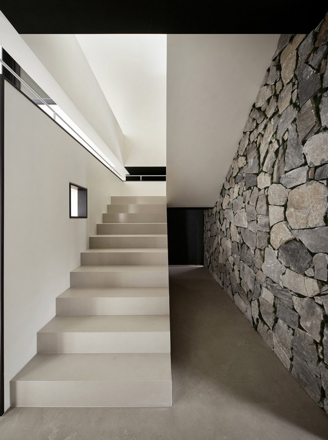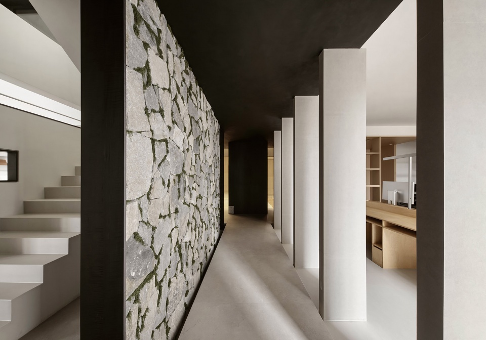 在这里,封闭感被光与视野消解,空间成为连接思维与现实的媒介。客户与设计师在此相遇,不仅选择材料,更是在一场感官的旅行中,确认美的共识。楼梯,不仅是连接空间的通道,更是一场光、材质与几何的静默叙事。浅色调的阶梯在精准的光线勾勒下,呈现出清晰的体块感,与一侧粗犷的天然石墙形成极具张力的对话。
