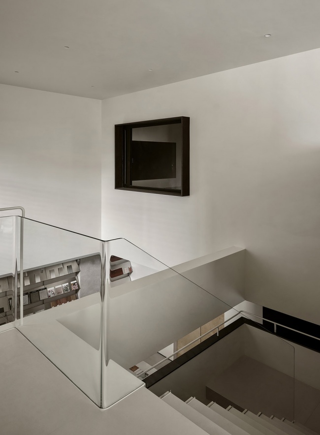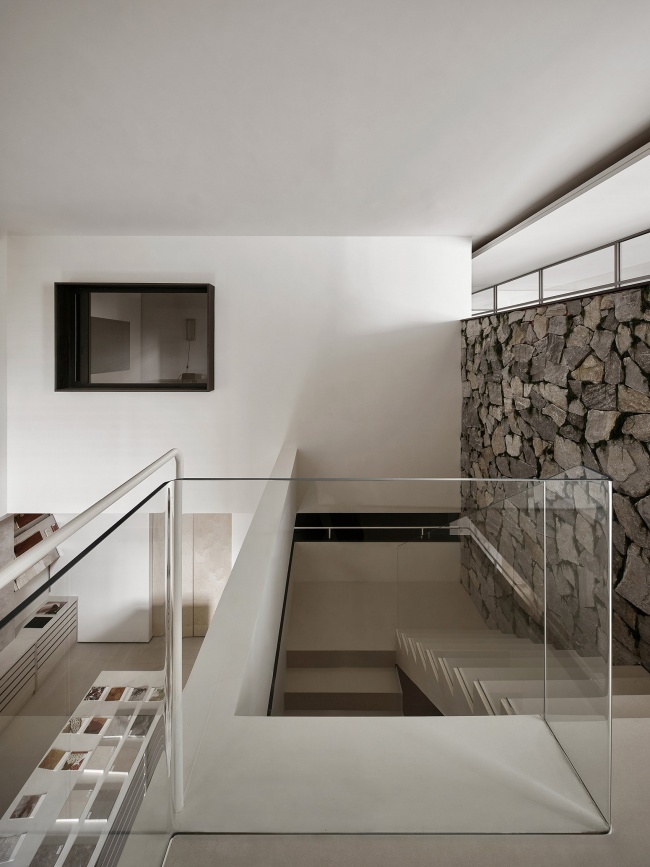 点、线、面的构成逻辑贯穿始终:展示墙的纵向划分、中岛的横向延展、视口的方形切割,在空间中交织出清晰的节奏与韵律。这种秩序不仅服务于功能,更赋予空间一种建筑学的诗意——材质不再是冰冷的样本,而是可触摸的灵感,是设计语言的词汇表。在这里,封闭感被光与视野消解,空间成为连接思维与现实的媒介。客户与设计师在此相遇,不仅选择材料,更是在一场感官的旅行中,确认美的共识。楼梯,不仅是连接空间的通道,更是一场光、材质与几何的静默叙事。浅色调的阶梯在精准的光线勾勒下,呈现出清晰的体块感,与一侧粗犷的天然石墙形成极具张力的对话。