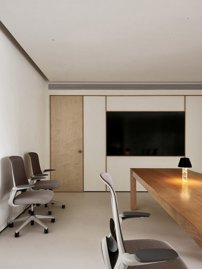 Function and aesthetics seamlessly merge. Presentations, conversations, and contemplation can all shift自如 within the same atmosphere. Light is meticulously calibrated. It does not merely illuminate, but envelops, crafting an immersive field that puts the mind at ease. What is celebrated here is not instant expression, but a quality that withstands the test of time—allowing important conversations to deepen naturally within quiet and Noble. A large, solid meeting table forms the absolute core of this space. The natural wood grain of the tabletop unfolds like ink wash, retaining the material’s原始 texture and softening the formality of traditional meetings. Chairs arranged freely around it encourage people to join the discussion from different angles. This is not merely a place for meetings, but an “idea incubator” that fosters team resonance and stimulates collective wisdom. It uses a relaxed, lived-in atmosphere to quietly dissolve hierarchical barriers, allowing every exchange to return to its essence: focused, equal, and full of creative potential.
