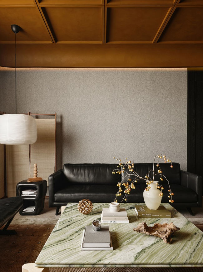 如果说开放会议区是思维激荡的广场,那么这间独立的包间则更像一个收藏思想、孕育深度的精神壁炉。空间不语,却自有其声。它以一种低调的奢华感,诠释着“老钱风”与“意式高奢”融合后的沉静力量。顶部极具雕塑感的线性设计,不仅仅是装饰,更是一种视觉的艺术。线条纵向延伸,巧妙地在方寸之间营造出豁然开朗的尺度错觉,让空间向上生长,充满呼吸感与向上的张力。空间的基调由精良的材质共同谱写,墙面覆以温润织物,赋予内敛底色。一张石纹如山水泼墨的茶几,成为视觉的锚点,将自然的野性凝练于沉稳之中。家具的轮廓利落而谦逊,顶级皮革的质感在暖光下低语。
