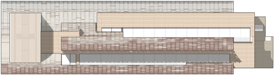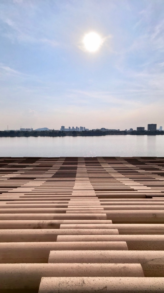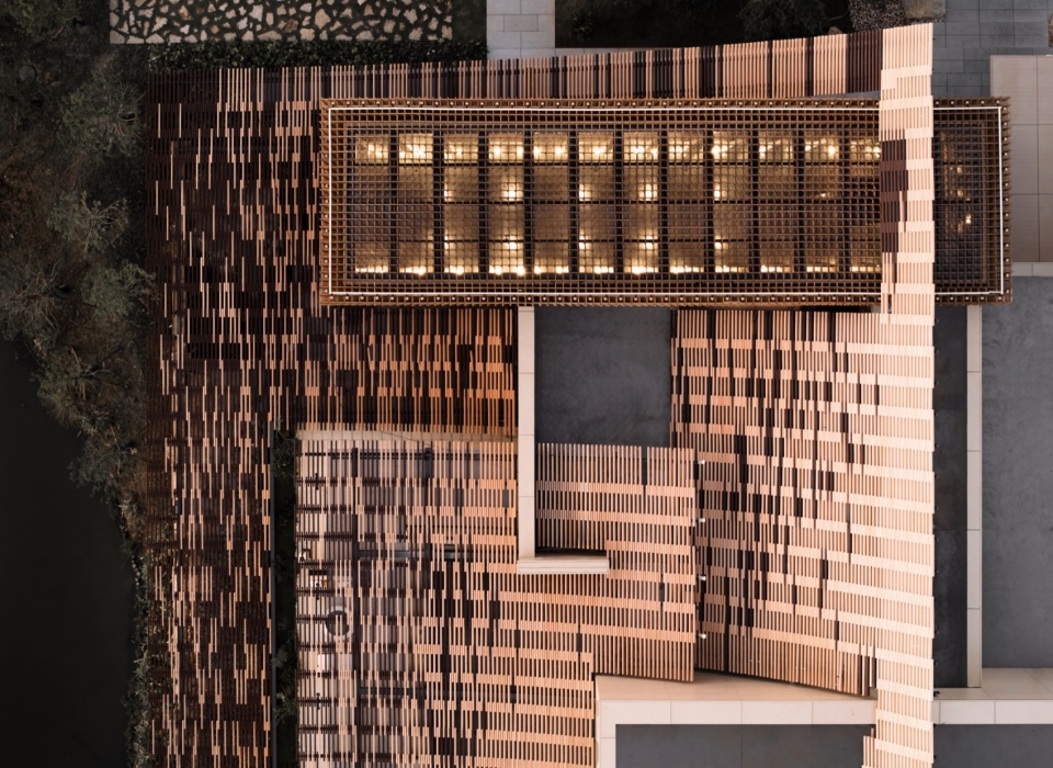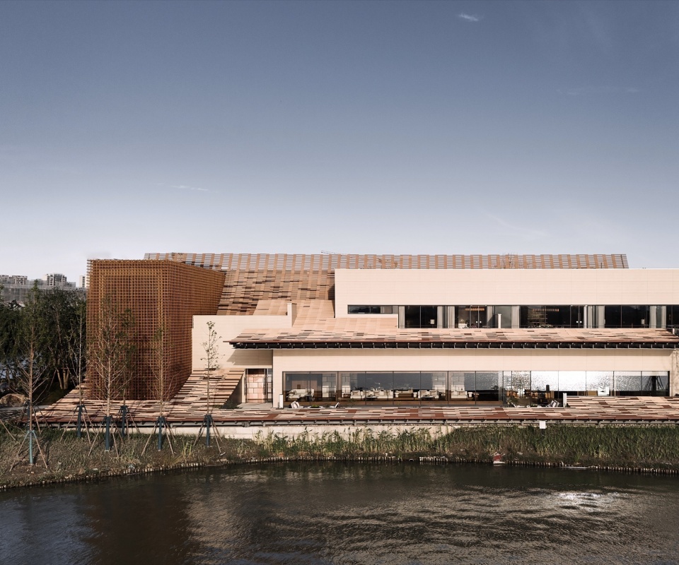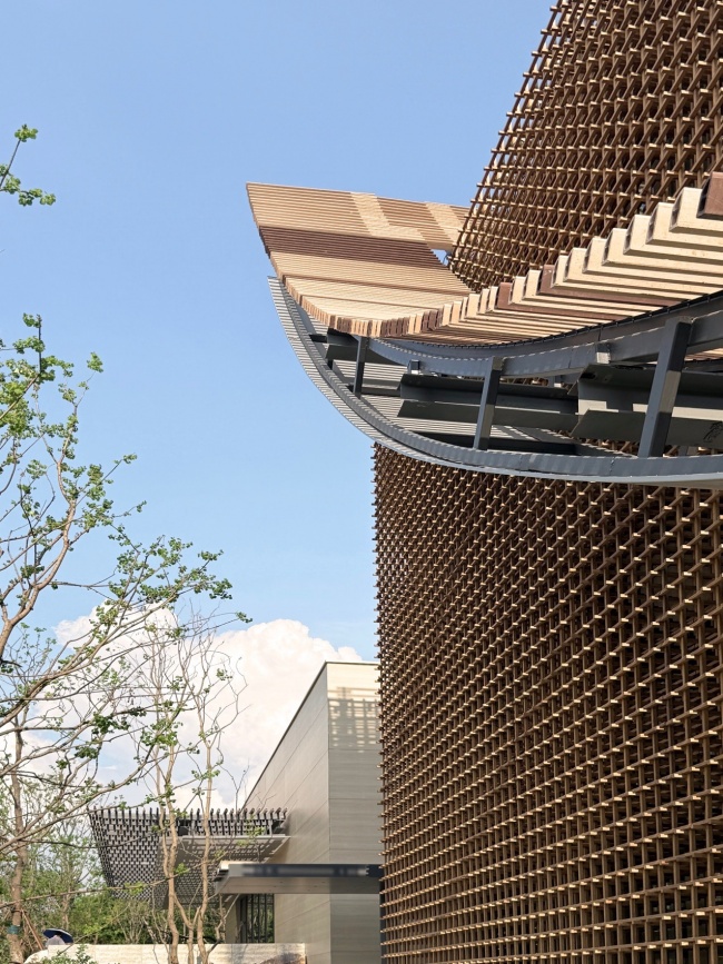 The three curved roofs of the Wisteria Pavilion are composed of nearly 8,000 handcrafted ceramic rods in red and brown tones, whose colors resonate harmoniously with the natural environment of Zilang Lake. The two colors are randomly distributed through parametric calculations, subtly translating the shimmering surface of the lake into a rhythmic façade texture. In addition, the spacing and length of the ceramic rods were determined through thermal performance calculations, ensuring that aesthetic qualities are maintained while effectively reducing solar radiation and improving shading performance. In this way, aesthetic expression and ecological function are brought into alignment.