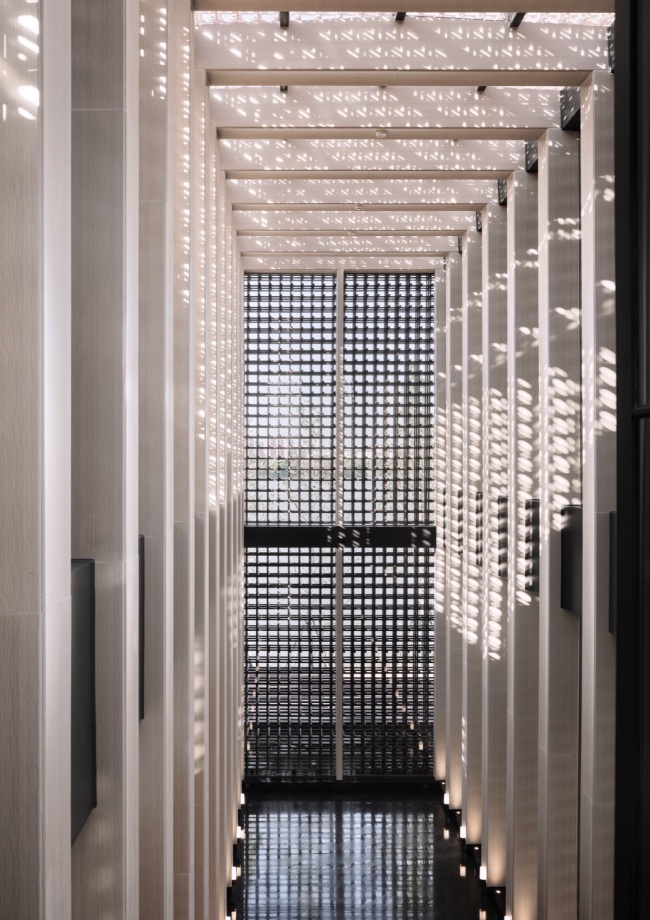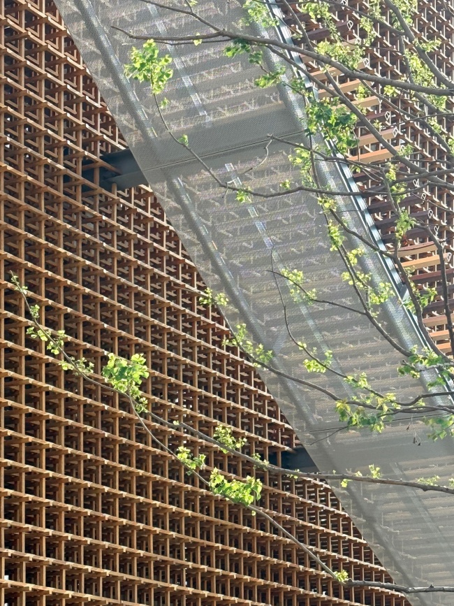 中国近代实业家、教育家张謇在其故居濠南别业入口亲手栽种了两株紫藤,历经百年风雨洗礼依旧枝繁叶茂、成为南通企业家精神的具象化象征。驿站将“紫藤”这一文化符号转化为可感知的空间形态,建筑在面向紫琅新天地一侧,以紫藤花架为原型,采用耐候重组竹材以方格模块搭建了一个矩形通高的精神空间,契合紫藤藤蔓攀援的态势,呼应紫藤“向上而生”的姿态。方格模块组合形成精细轻盈的表皮,阳光穿过网格间隙,洒下流动的光影,观者仿佛漫步于百年紫藤花下,实现自然与文化体验的双重共鸣。竹材特有的自然纹理、温润质感与坚韧属性,与紫藤的 “自然之美”、“坚韧之性” 形成呼应,成为南通企业家精神的纪念性空间与传播载体。