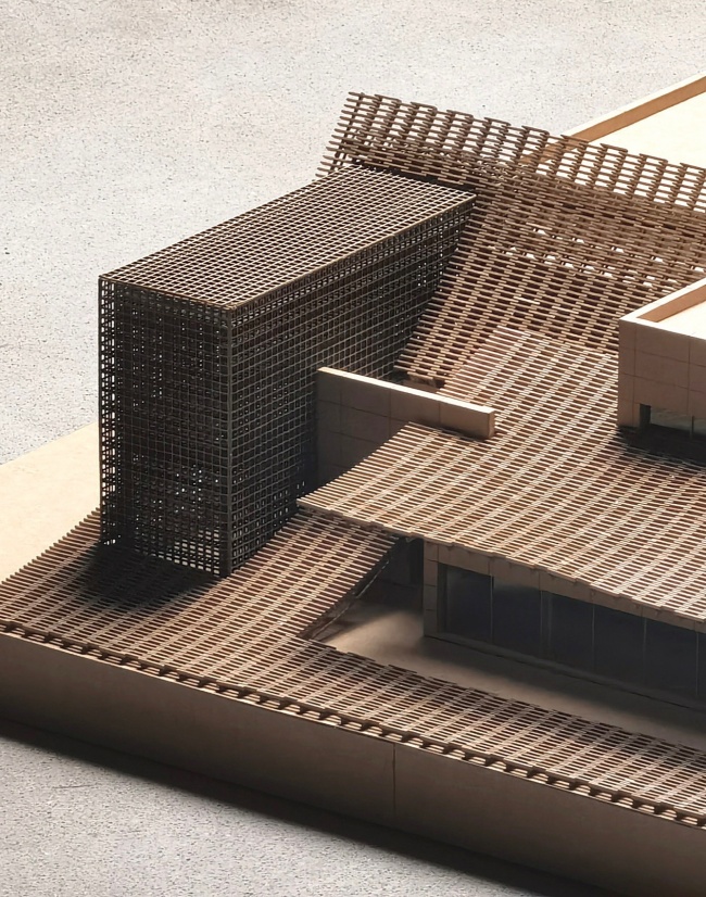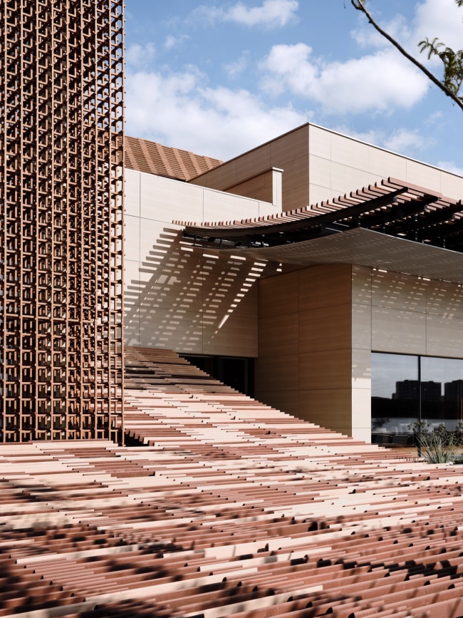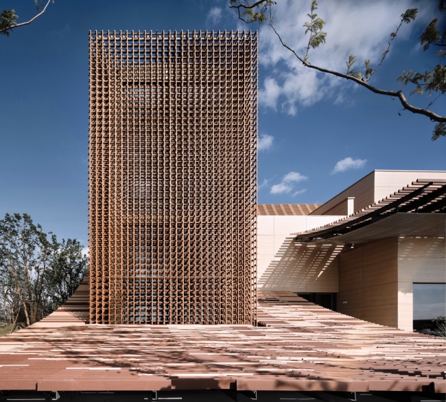 紫藤驿站致力于诠释尊重自然、顺应环境的可持续营造哲学,建筑从材料选择到构造方式,从空间体验到文化表达,无不体现对自然与人文的尊重。艺术中心采用手工质感陶棍、耐候重组竹、木饰面板等自然属性的材料,以积极但谦逊的姿态参与场地的生态循环与文化演进,“消失的屋面”生长临时诗意。紫藤驿站的三处曲面屋顶采用近 8000 根红、褐两色手工质感陶棍,陶棍的色彩与紫琅湖的自然环境形成和谐呼应。二种颜色的陶棍通过参数化计算进行随机排布,巧妙地将紫琅湖波光粼粼的湖面景致,转译成为富有韵律感的立面肌理。此外,陶棍的排布间距与长度经过热工计算,在保证美学效果的同时,有效降低了建筑的太阳辐射,提升了建筑的遮阳性能,实现了美学功能与生态功能的统一。