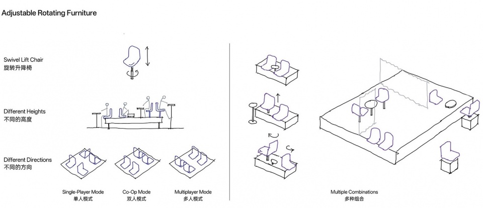 在改造策略上,我们兼顾了情感留存与功能创新:餐椅主体保留了原有形态,以唤起记忆,建立情感连接;底座则进行全新改造,通过旋转升降结构的设计实现高度与朝向的多维调节。结合高低错落的平台与模块化家具设计,共同塑造出能灵活适配多种校园生活模式的场景。熟悉的物品与环境以创新形态重现,既承载过往记忆,又赋予使用新意。