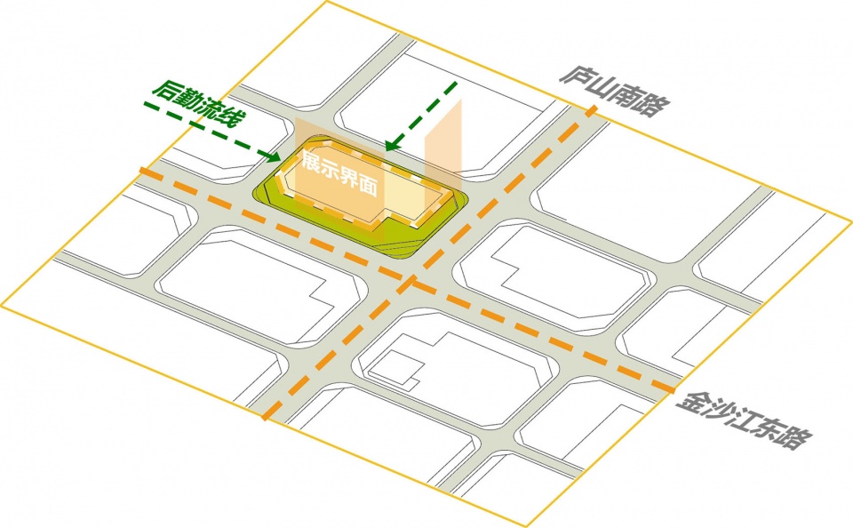 ▼根据城市展示界面确定后勤流线、车行流线关系