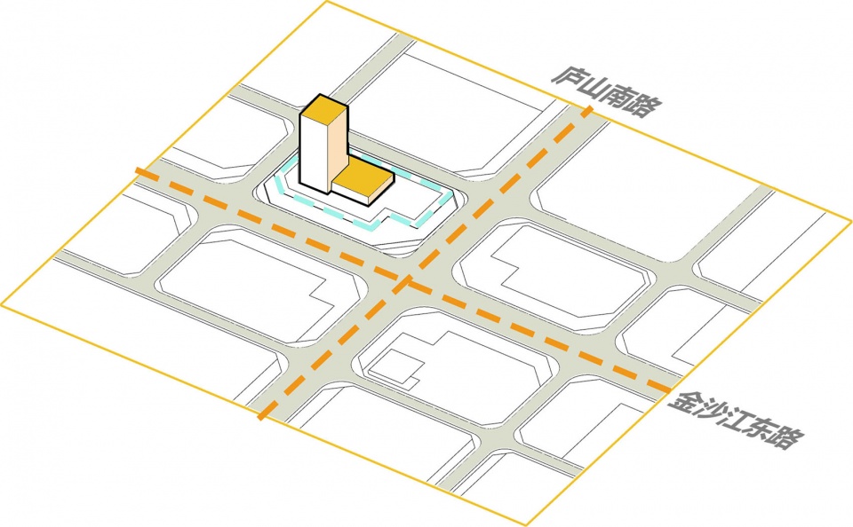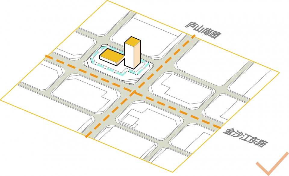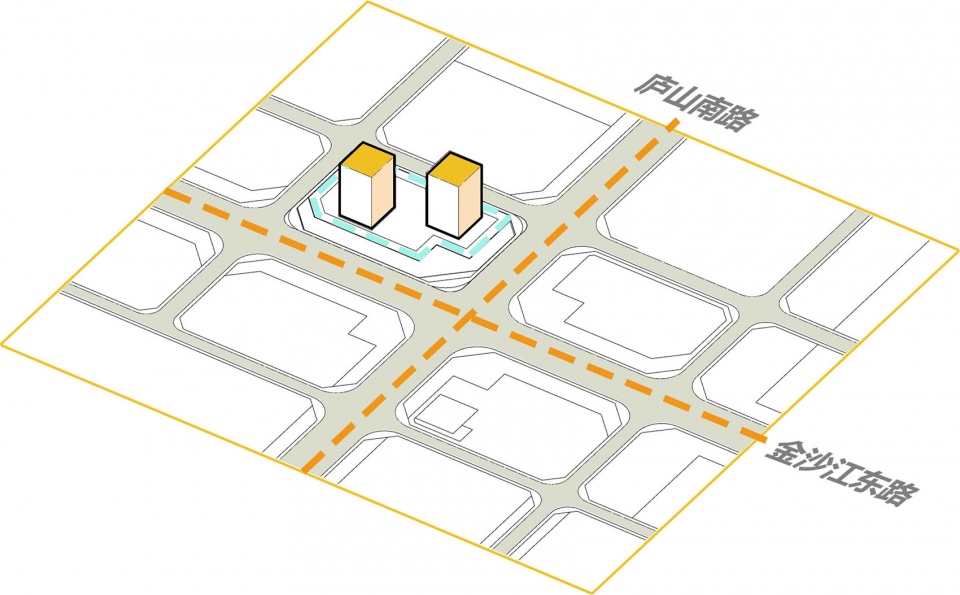 The single tower is positioned at the northeast intersection, aligning with the main pedestrian flow from the central urban area. It forms a landmark-scale volume and represents the most rational tower layout scheme. Moreover, each road corridor enjoys relatively favorable display facades along the sightlines.