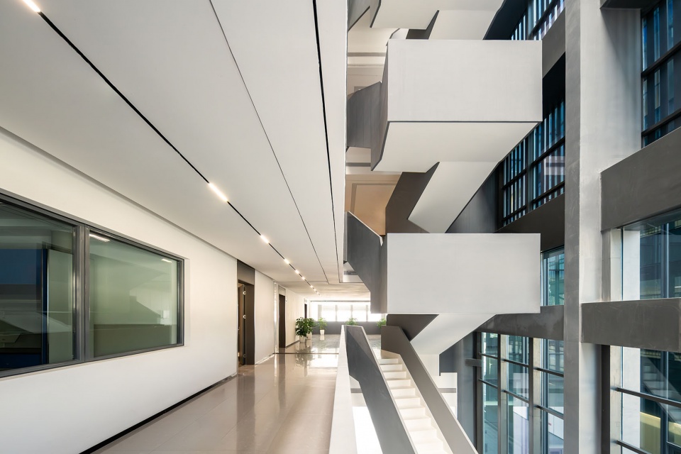 Establish the four-dimensional circulation system—“underground, ground level, tower and podium”: For the underground level, an innovative “ground-like” design is adopted. Centered around a courtyard, the layout features a U-shaped main circulation route, complemented by two secondary routes and two dedicated service lanes. These pathways connect laboratories, parking areas, and other functions, while natural light is introduced to alleviate any sense of confinement.