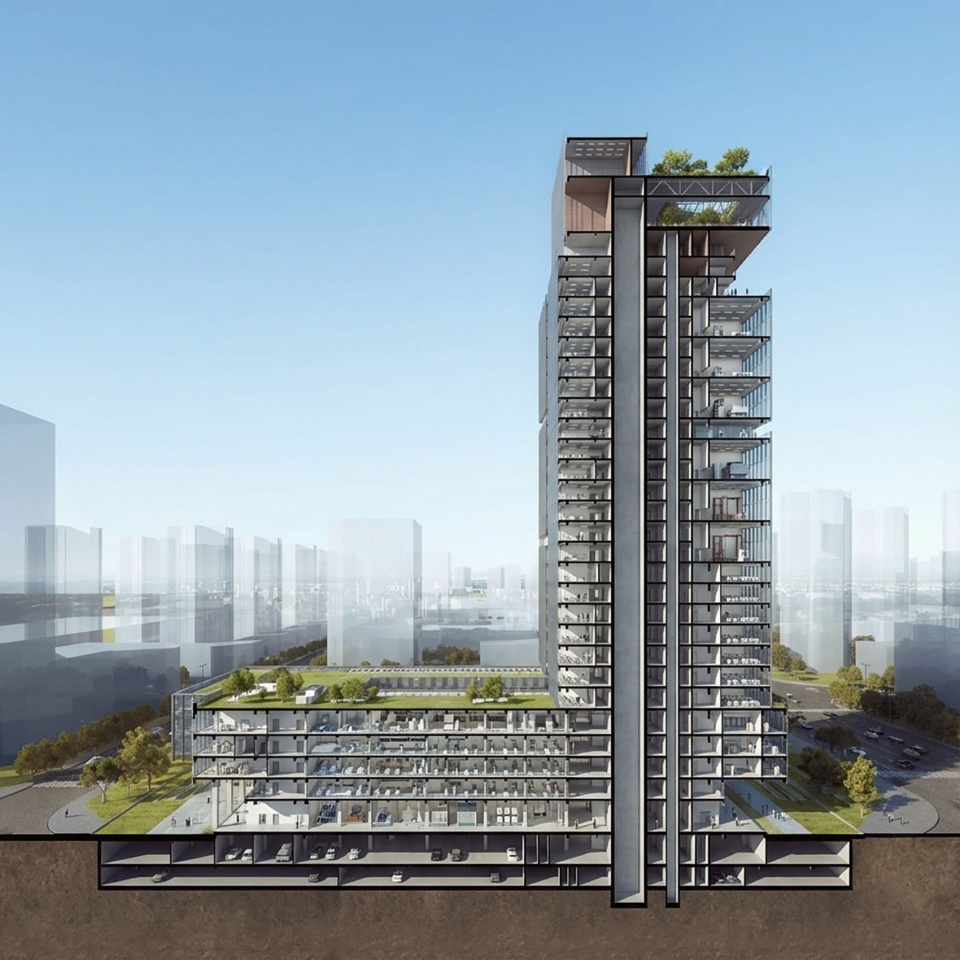 超限结构处理是技术核心:塔楼顶层用“悬挑桁架+吊柱”,在120m高空实现1000m²8m层高无柱空间;15-24层“隔层设梁”形成5个300m²双层通高区;裙房用“斜柱转换”将内部柱移至边缘,实现三层1000m²无柱实验空间,兼强立面特色。绿色技术系统落地:通过建筑偏转、下沉庭院、绿色屋顶优化微气候;高性能玻璃幕墙(传热系数≤1.8W/(m²・K))+自然通风构造降低能耗;“植草沟+雨水花园+回用系统”实现85%雨水控制率,打造城市“海绵”。