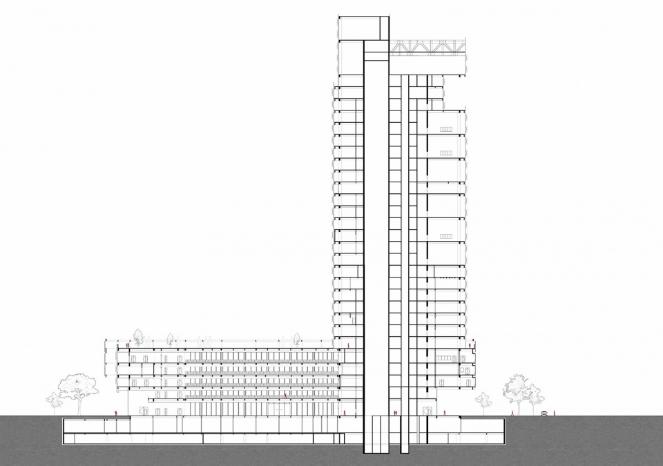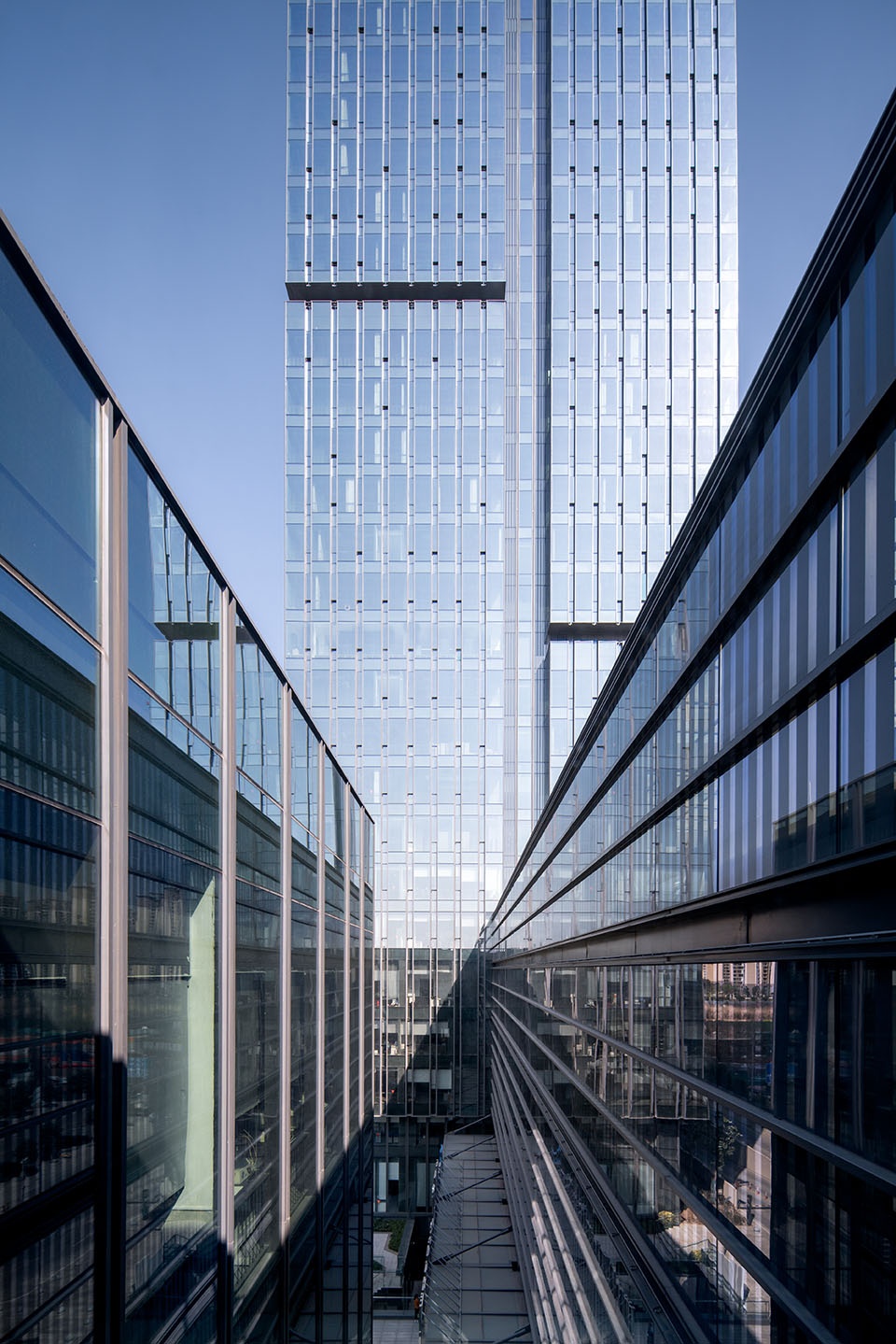 Sustainability: Building form and surface-area-to-volume ratio are optimized. The roof (the “fifth façade”) is carefully coordinated to integrate mechanical rooms (topped with covered walkways), piping (directly routed to the roof), and rest platforms, preserving the integrity and continuity of the façade design.