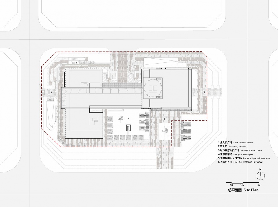 Resolving Functional Complexity through “Modular Division + Skeleton Attachment”:To address the challenge of functional integration, the design begins by breaking down the National Inspection Center (encompassing laboratories, sample reception, and mechanical testing) and the Data Center (including command, computing, and exhibition functions) into independent modules, each tailored to specific usage requirements and spatial scales. These modules are then connected via dual 100L-shaped circulation volumes operating both horizontally and vertically, acting as a “skeletal framework.” Horizontally, the 100L-shaped volume links the podium, exhibition halls, and underground spaces, facilitating smooth horizontal connectivity; vertically, it accommodates high and low-zone elevators and utility shafts, enabling clear vertical zoning. Around the “skeleton,” seven major functional zones are organized—including the Urban Exhibition Hall and the Data Center. Specifically, the lower levels house the National Inspection Center, while the upper levels are dedicated to the Data Center, effectively avoiding operational interference. In addition, distinctive features are integrated to enhance spatial value, including a 1,000m² 360° Cloud View Exhibition Hall (with an 8-meter floor-to-floor height at the tower’s top level) and a 1,000m² Emergency Command Center (featuring a column-free space within the podium).