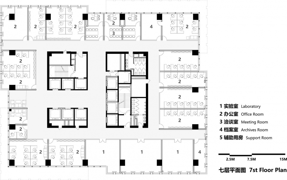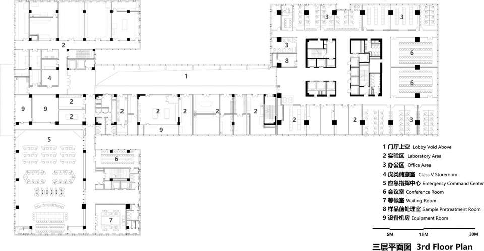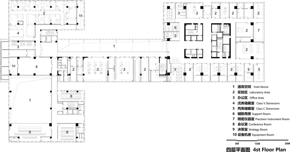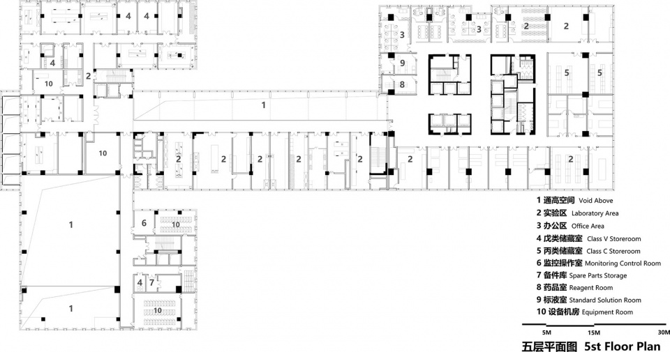 The podium is organized along an east–west main circulation spine connecting to the tower, supplemented by north–south secondary routes and branch paths for laboratory access. This arrangement aligns seamlessly with the workflow of “sample collection – testing – analysis.”