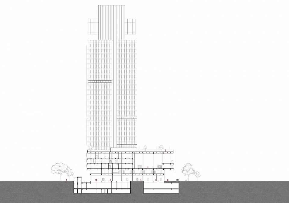 Distinctiveness: Visual richness is enhanced through elements such as the “floating” exhibition hall at the tower’s summit and the dynamic lines created by sloping columns transitioning through the podium, adding depth and movement to the building’s appearance.