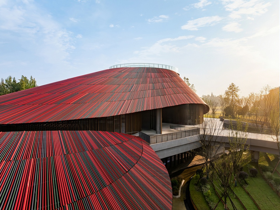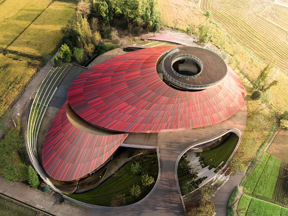 Like Douban grains scattered in the fields, the museum is naturally embedded in the Western Sichuan Linpan environment, where “fields form the background and dwellings act as the figure.” The chromatic roof creates a distinctive “Pepper-Top,” extending the gentle pitched roof typology of the Linpan and adapting to the basin climate. Using modern techniques to interpret roof hierarchies, the design recreates a staggered, lively form. From the structural logic of Glulam joinery to the light-and-shadow narrative of bamboo grilles, local materials and modern craftsmanship coexist. The project allows Linpan genes and Douban culture to deeply integrate, writing a vivid footnote for the vernacular innovation of Western Sichuan architecture.